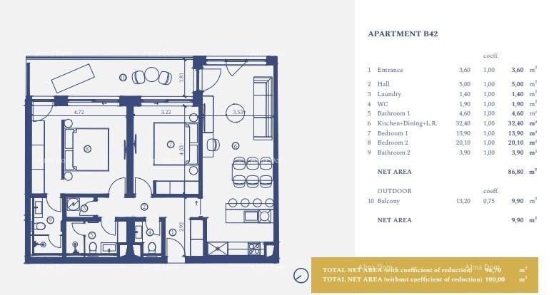 V nabídce je 179 bytů různých typů a velikostí: Apartmán B-42 (102 m2) sse nachází v2. patře: Byt se skládá ze vstupní části, 2 ložnic, 2 koupelen, WC, podkroví, kuchyně, obývacího pokoje a jídelny a balkonu 9,9 m2.