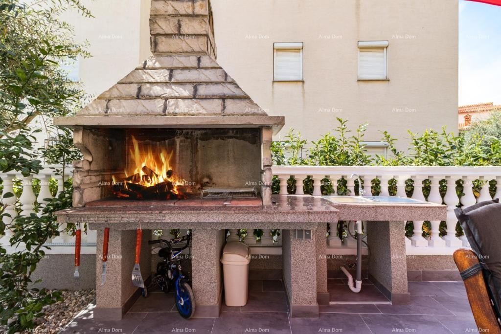 Byt se skládá ze dvou ložnic, koupelny, toalety, kuchyně s jídelnou a obývacího pokoje, který se otevírá na oplocenou zahradu s bazénem a grilem.