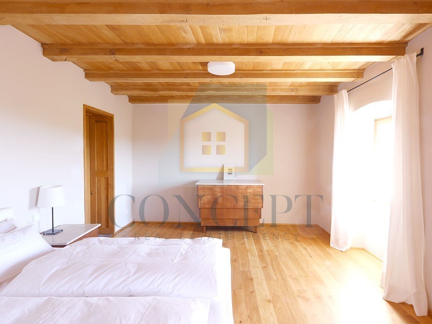Es besteht aus einem dreigeschossigen Herrenhaus mit Eingangsbereich, Wirtschaftsgebäuden und zusätzlichen Räumen für verschiedene Zwecke. Das Hauptgebäude verfügt über sieben Schlafzimmer – fünf mit eigenen Bädern und zwei mit Bädern im Flur. Im Erdgeschoss befindet sich das Hauptschlafzimmer mit Wohnzimmer und Bad, die anderen Zimmer sind auf den oberen Etagen verteilt. Zusätzlich sind Betten für Gäste und Kinderbetten verfügbar. Das geräumige Wohnzimmer mit Kamin, die große Küche mit Speisekammer und der Essbereich für bis zu 20 Personen schaffen einen einladenden Aufenthaltsraum. Im Dachgeschoss gibt es eine Arbeitsecke, und in einem separaten Gästehaus befinden sich ein Wohnzimmer mit Kamin, eine Teeküche, eine Terrasse mit Blick auf den Garten, ein Schlafzimmer und ein Badezimmer.