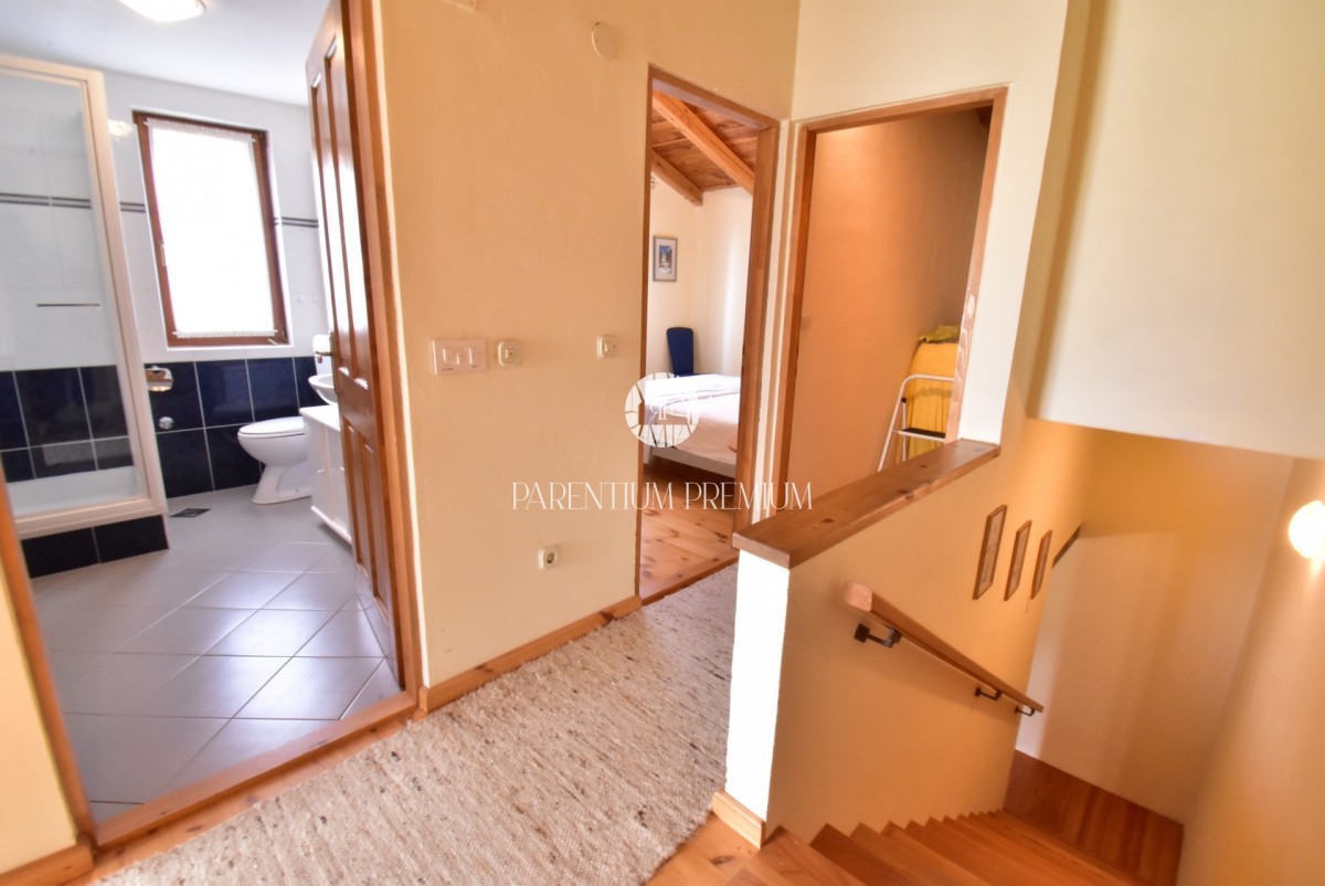 Im Obergeschoss befinden sich zwei Schlafzimmer, ein weiteres kleineres Zimmer mit Kinderbett sowie ein Badezimmer mit Dusche. Das Haus ist mit neuer PVC-Tischlerei und Insektenschutz ausgestattet.