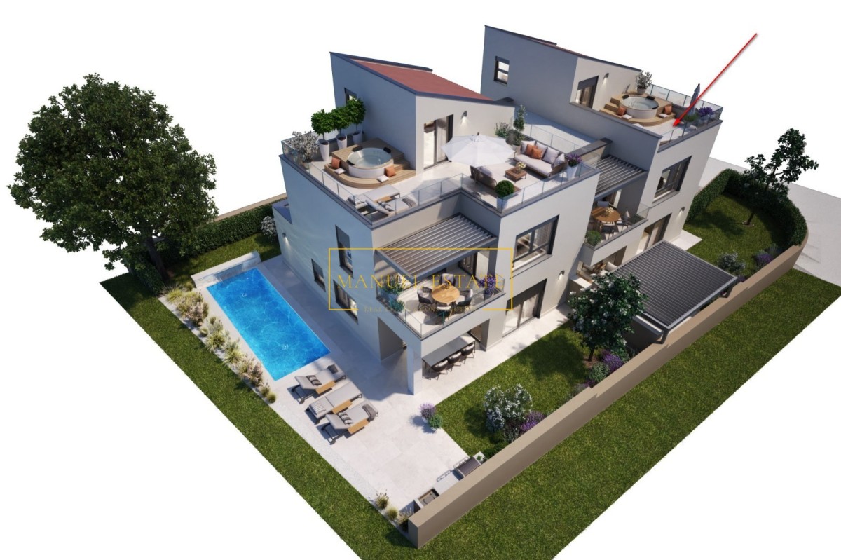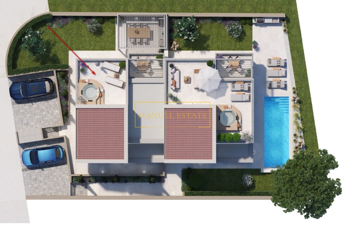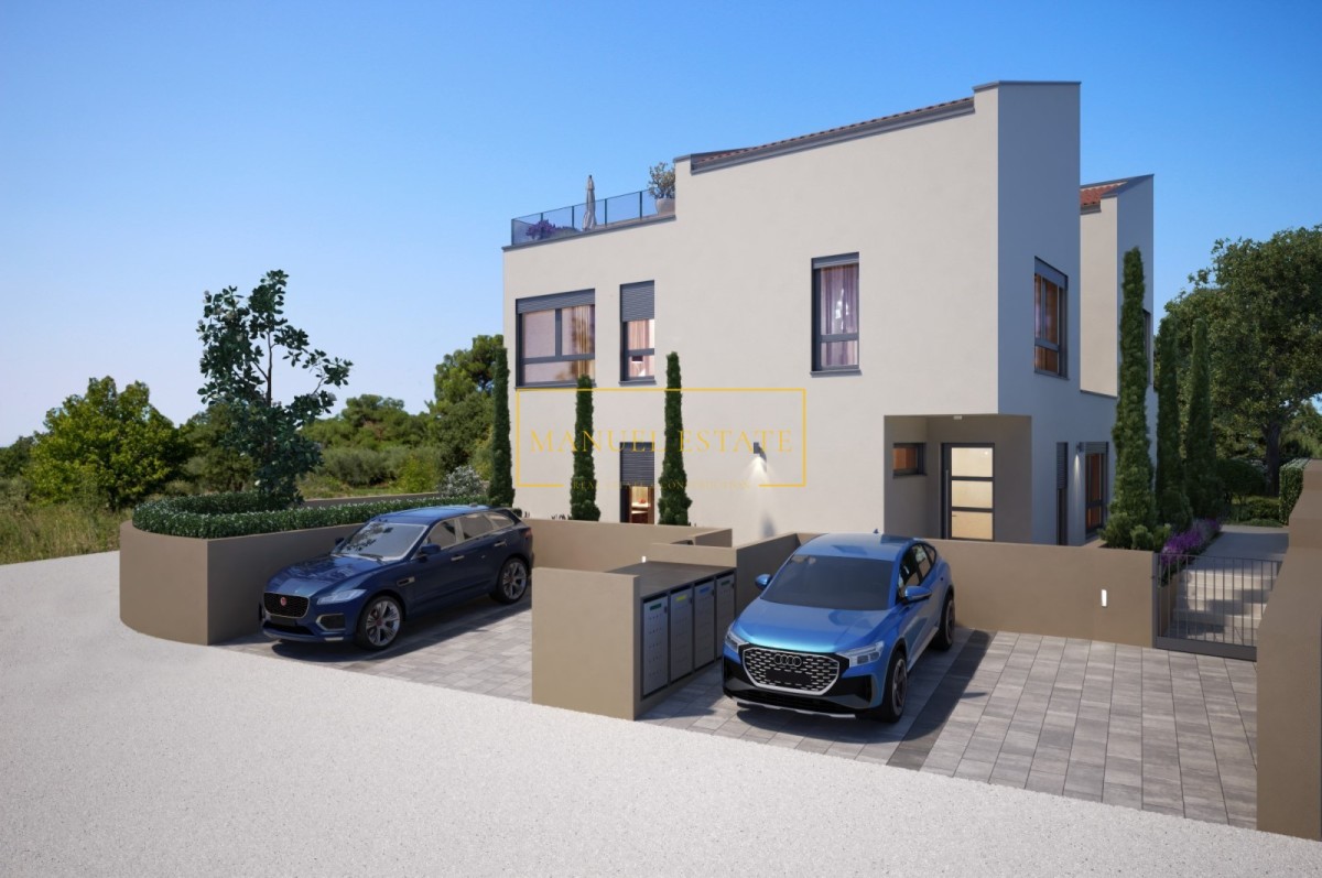 Geräumige Doppelhaushälfte in modernem Design, Gesamtwohnfläche von 200 m2 mit einem Garten von 150 m2. Es wird in ruhiger Lage in der Nähe des schönen Novigrad liegen, 2 km vom Stadtzentrum, dem Meer und den Stränden entfernt.