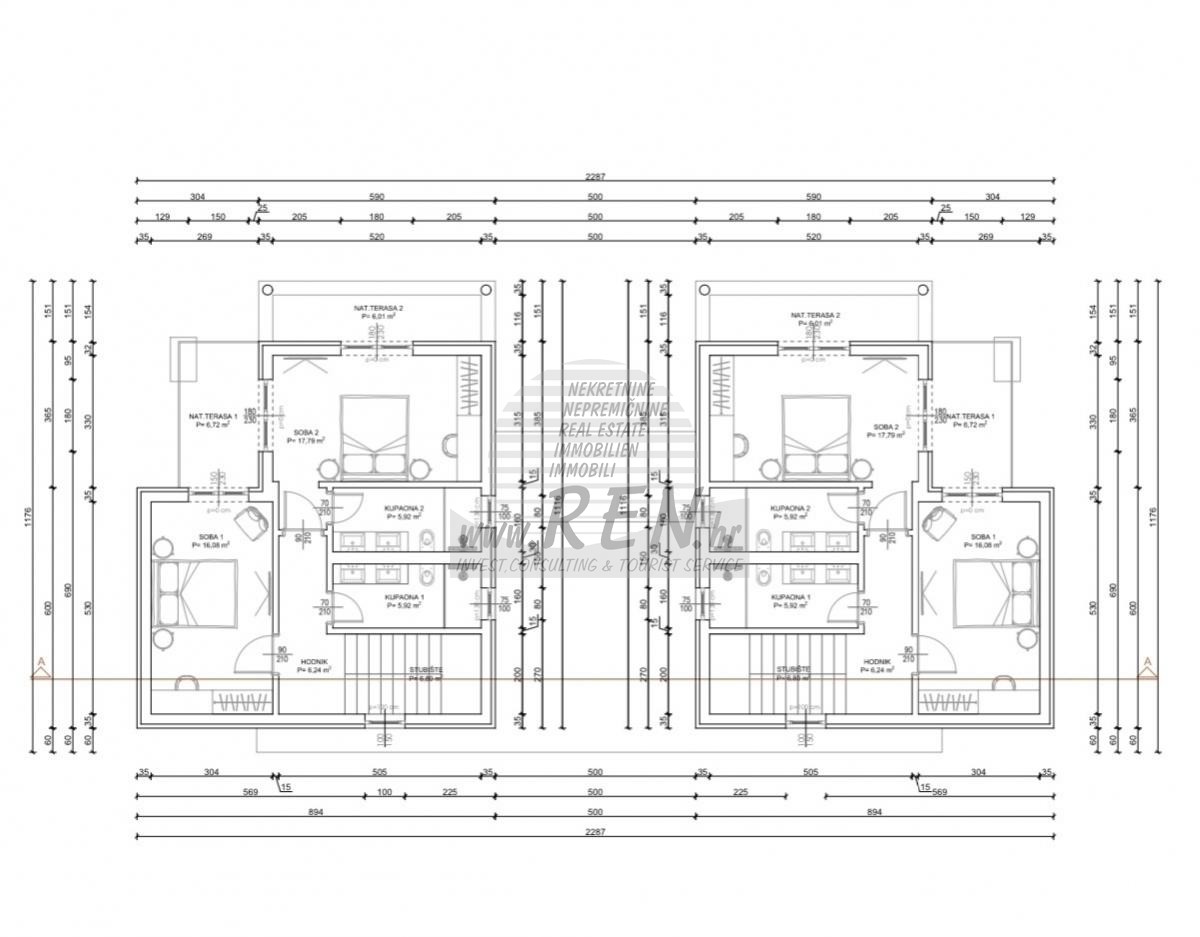 Im ersten Stock liegen zwei Schlafzimmer, jeweils mit eigenem Badezimmer und Zugang zur Terrasse, was zusätzliche Privatsphäre und Komfort bietet.