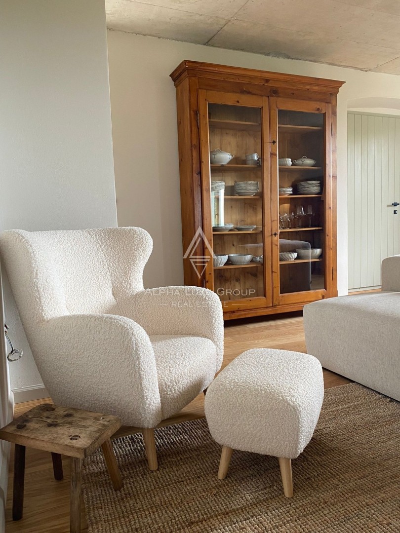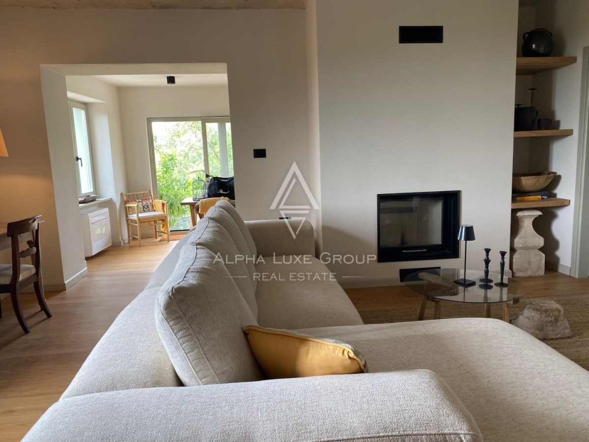 Im Erdgeschoss befindet sich ein Wohnzimmer mit geschlossenem Kamin, eine hochwertig ausgestattete Veneta Cucine-Küche und eine Toilette. Vom Erdgeschoss aus gelangt man in den Garten mit herrlichem Panoramablick auf die umliegenden Weinberge und die Natur. Im wunderschön angelegten und grünen Garten befindet sich ein Gartenhaus.
