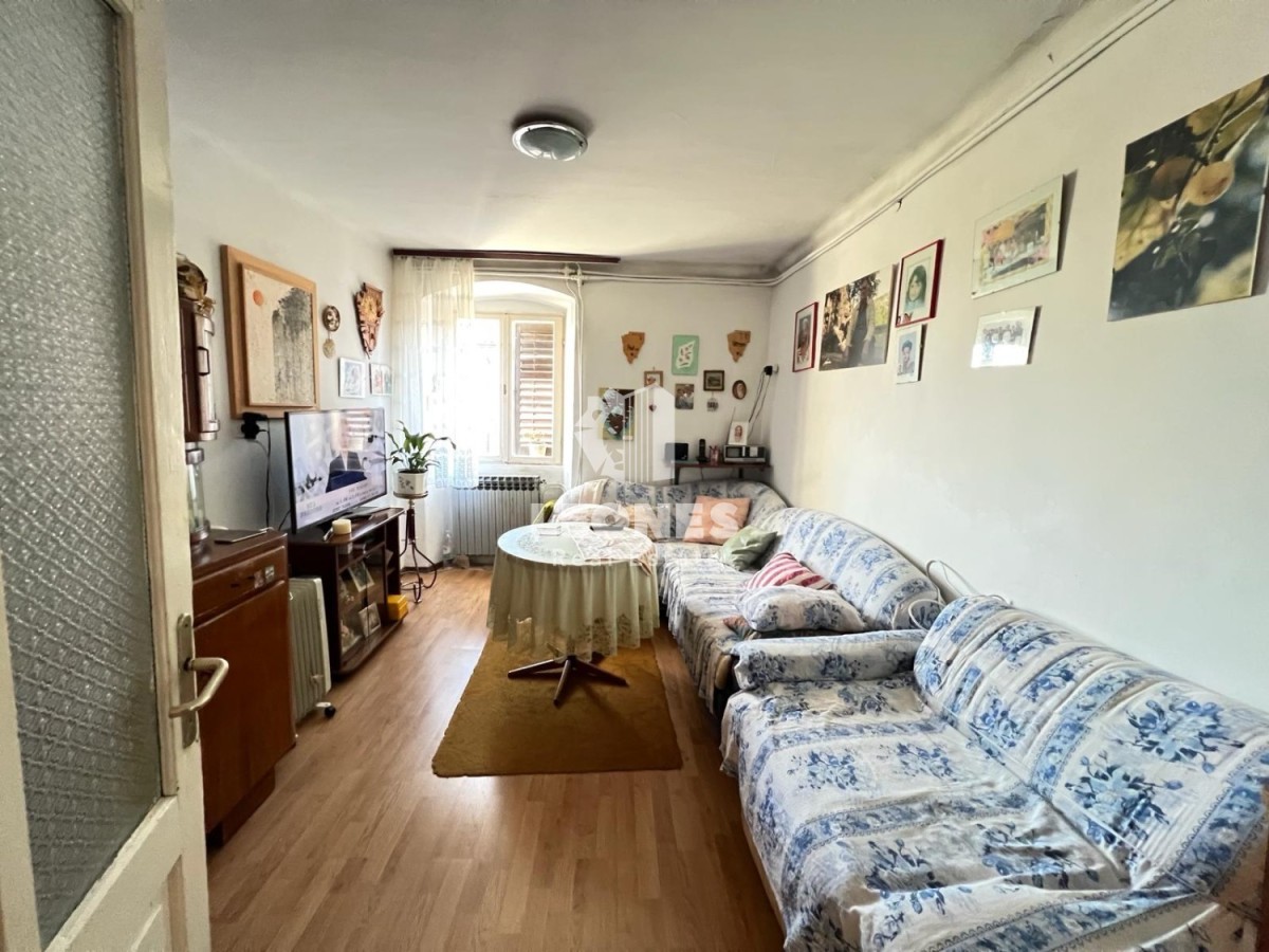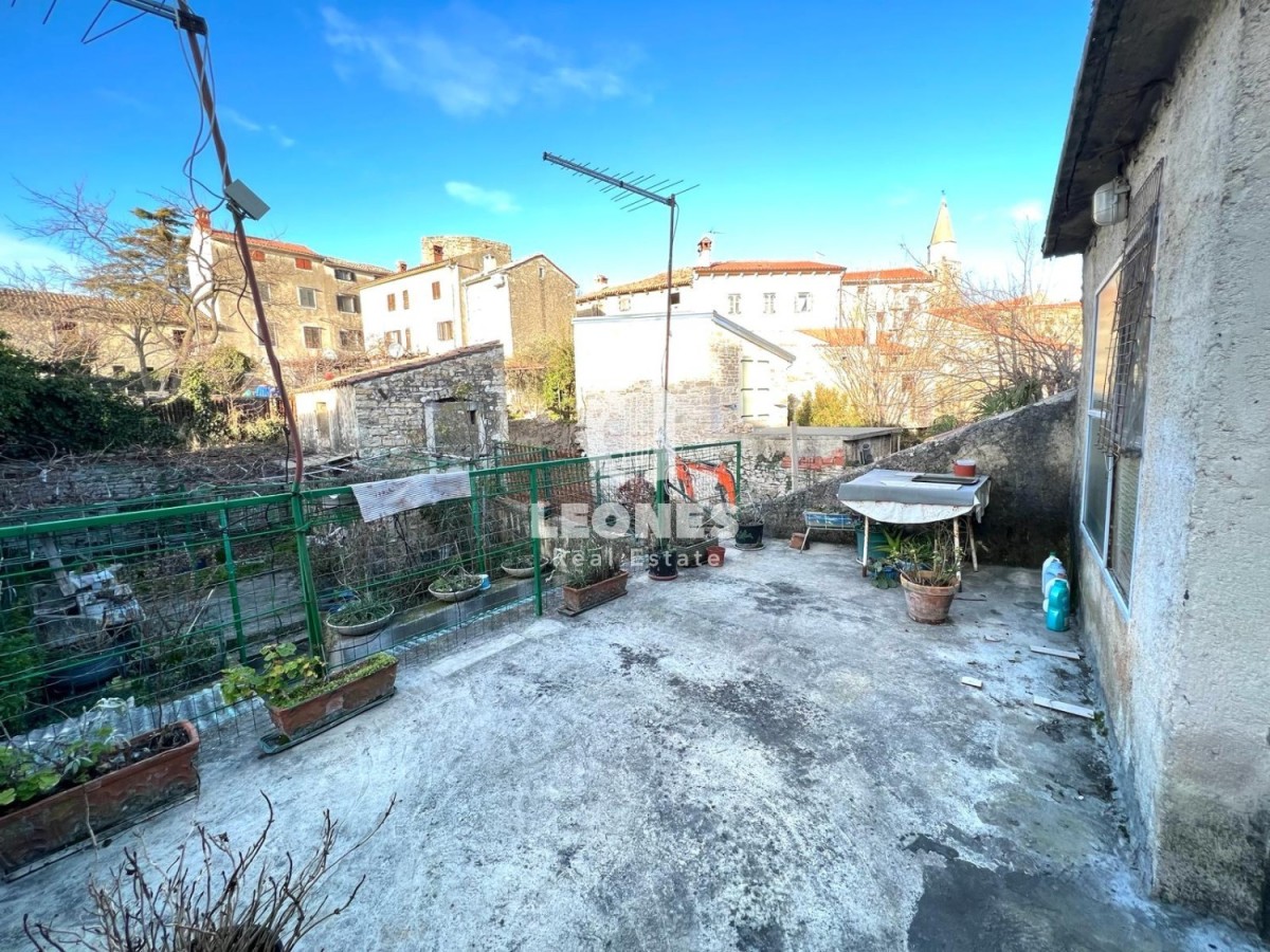 Zum Verkauf steht ein Haus mit Garten im Zentrum von Buje, das sich über zwei Etagen erstreckt und aus einer Eingangshalle im Erdgeschoss besteht. Im Anbau führt eine Treppe in die erste Etage, wo sich ein Wohnzimmer, ein Küchenbereich mit Esszimmer, ein Abstellraum und zwei Schlafzimmer befinden.