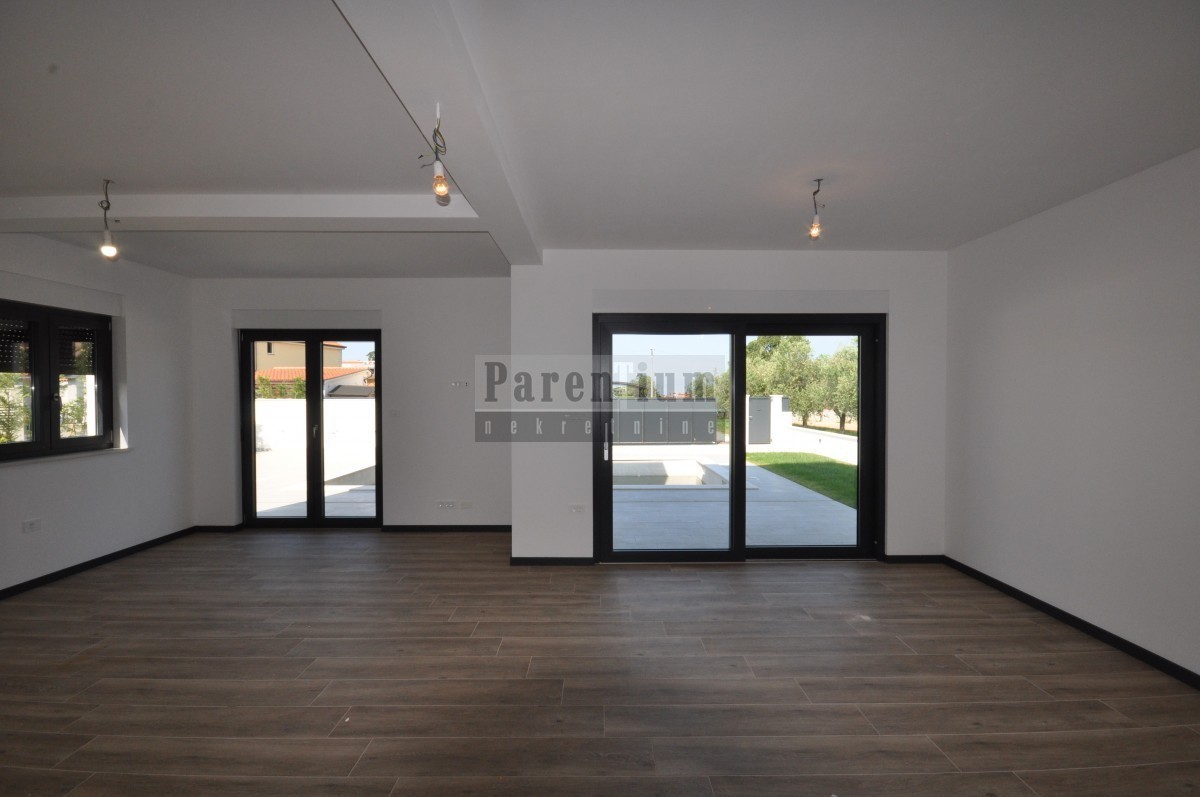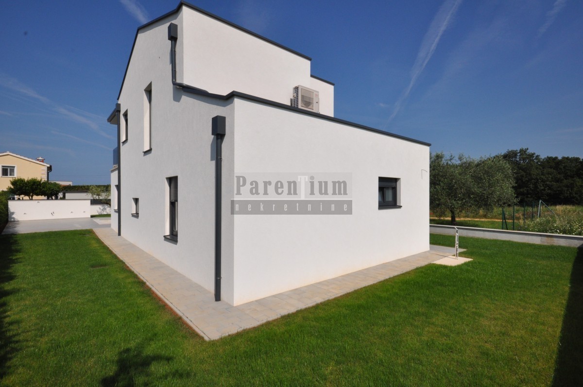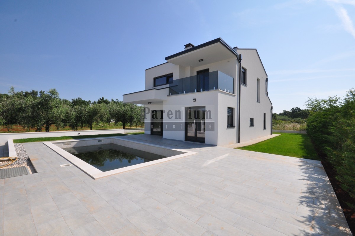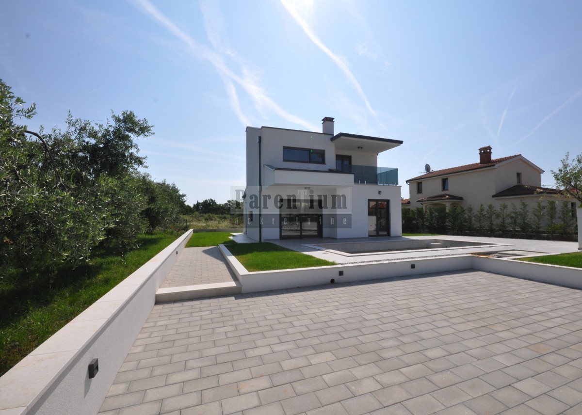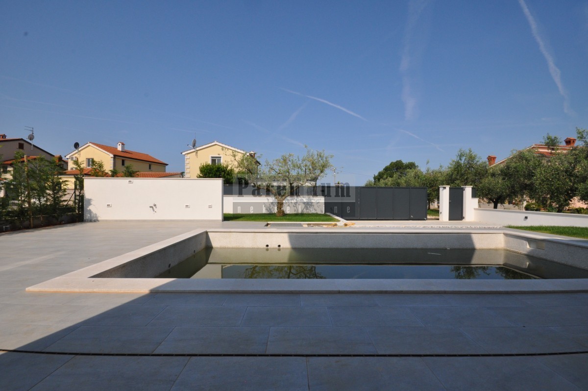 Dieses schöne, moderne Haus mit Swimmingpool steht in einer kleinen Stadt in der Nähe von Poreč zum Verkauf. Das Haus liegt am Rande des Dorfes, in einer ruhigen Straße.