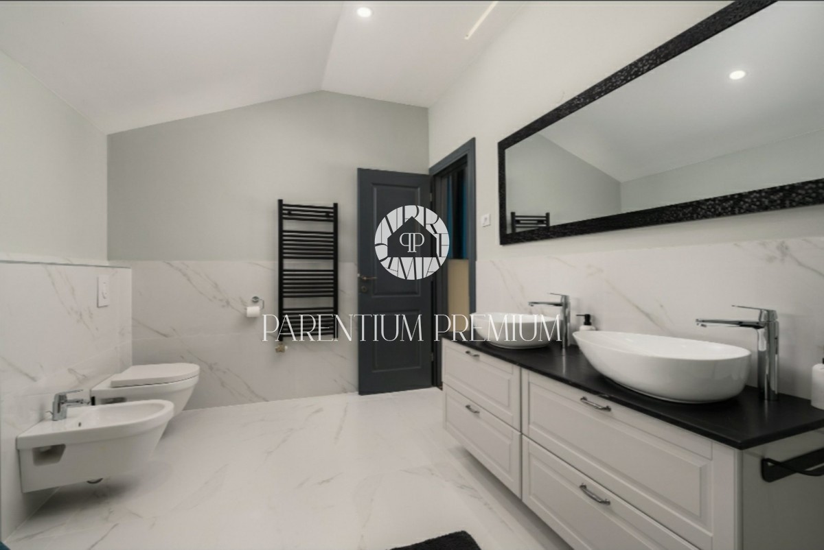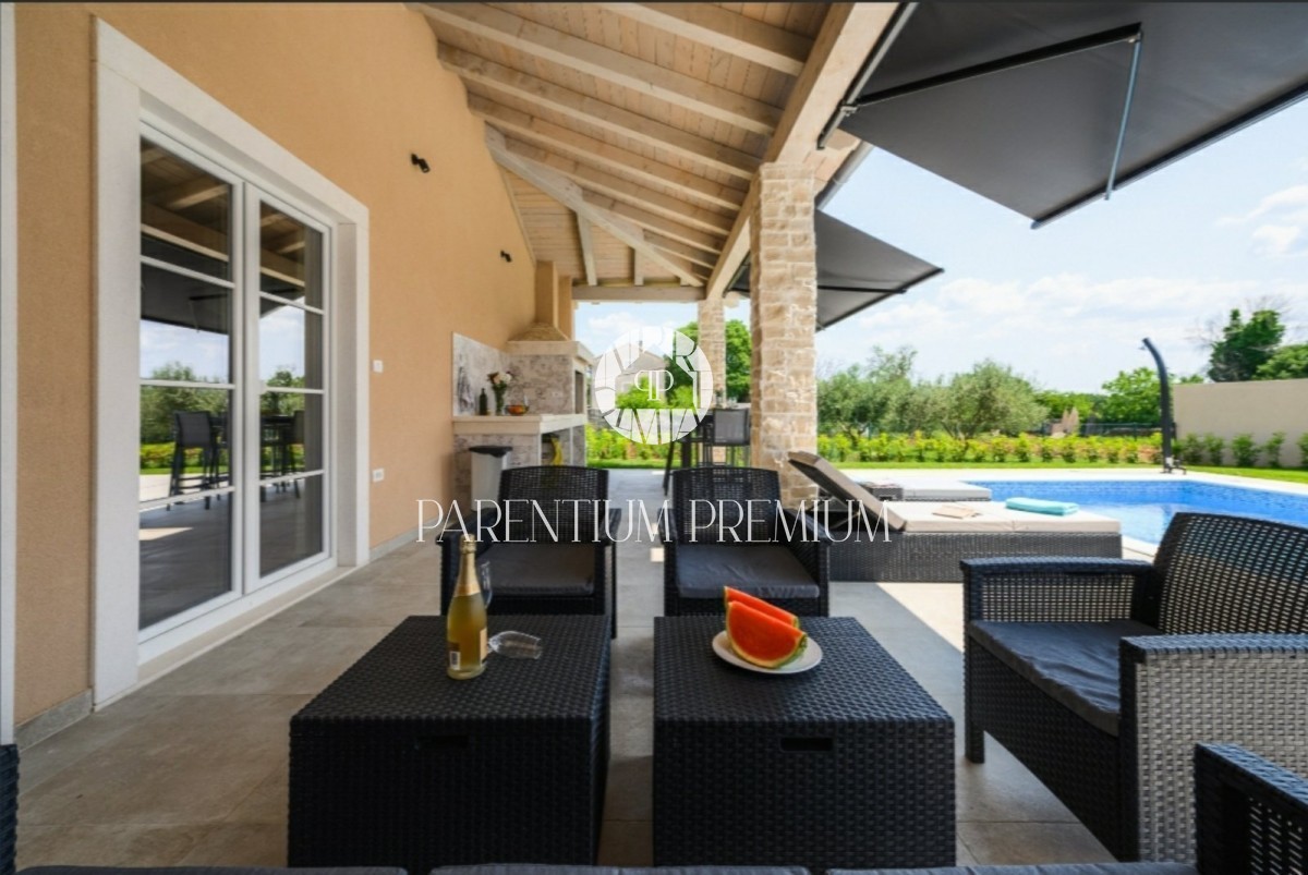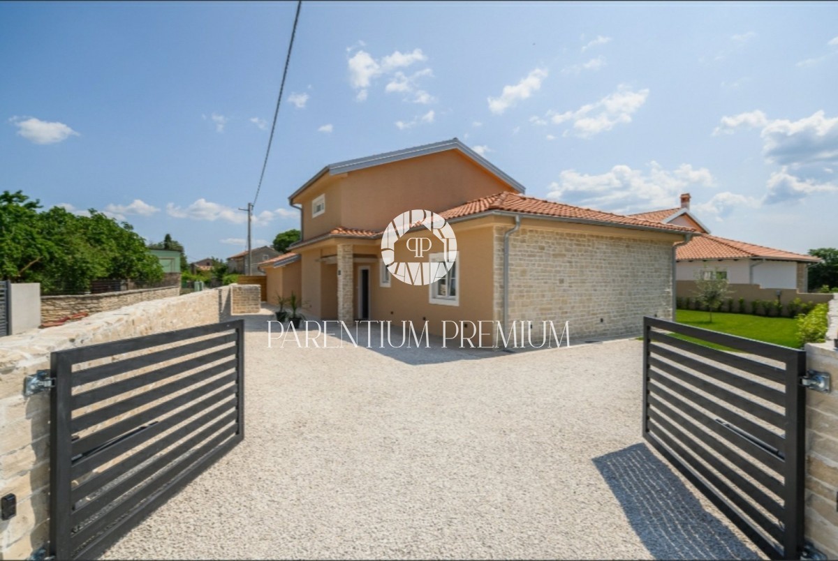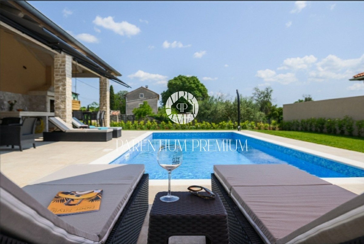 Diese neue Villa mit einem Pool von 180 m2, nur 15 Autominuten vom Zentrum von Rovinj entfernt, befindet sich in einem kleinen istrischen Dorf auf einem sanften Hügel. Das Haus repräsentiert eine Kombination aus autochthoner istrischer Architektur und modernem Design.