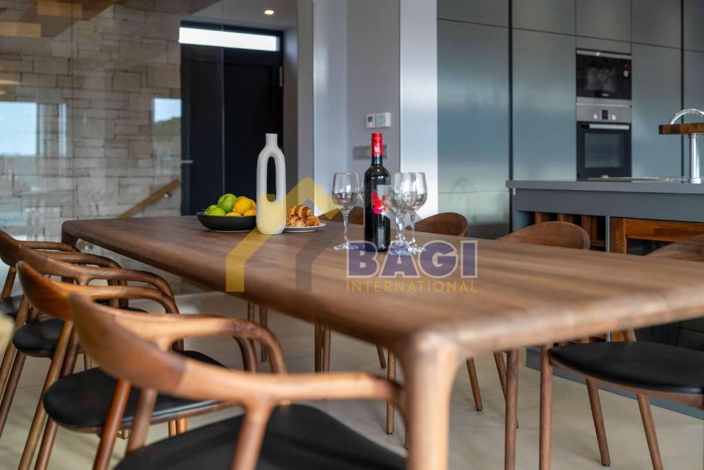 Im Erdgeschoss befindet sich ein großzügiger, offen gestalteter Wohnbereich mit Küche und Esszimmer, ausgestattet mit Designermöbeln und sorgfältig ausgewählten Details, die eine elegante und zugleich gemütliche Atmosphäre schaffen. Auf derselben Ebene befinden sich zudem ein Abstellraum bzw. Ankleidezimmer, ein Gäste-WC sowie ein Holzofen, der zusätzlich für Behaglichkeit sorgt.