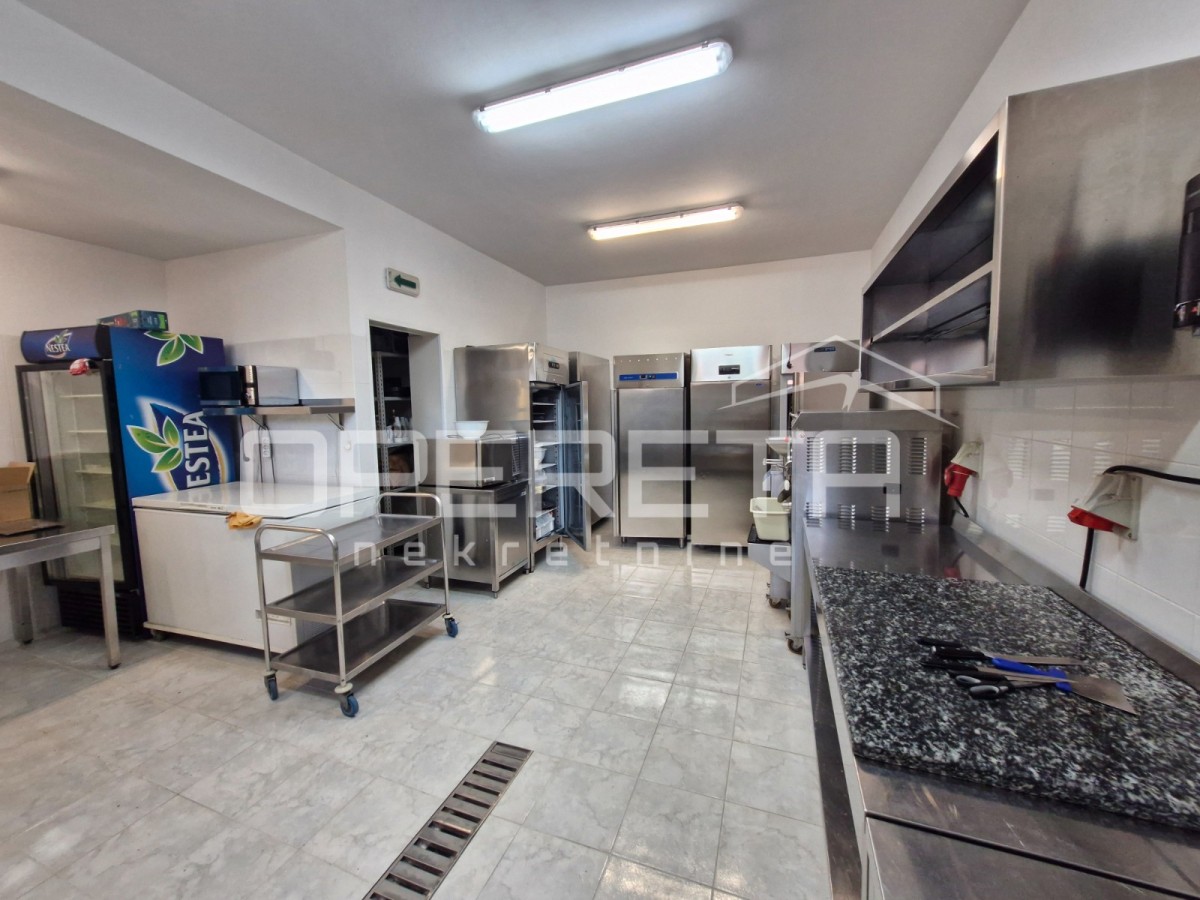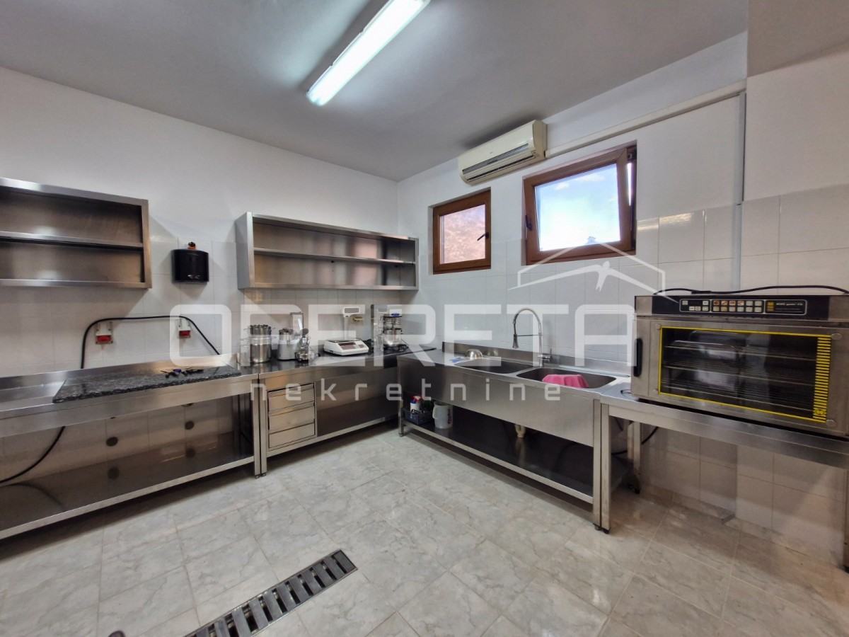 Das Erdgeschoss ist als Geschäftsraum konzipiert, ideal für eine Konditorei oder ein Café, mit kompletter Ausstattung einschließlich Küche, Garderobe und Servierbereich. Ein zusätzlicher Vorteil ist die Erlaubnis zur Nutzung der Terrasse während der Sommermonate, was sie für Gastronomiebetriebe sehr attraktiv macht.