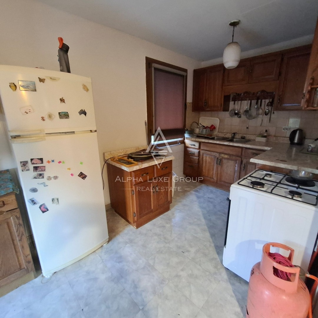 Das Haus besteht aus einem Keller, einem Erdgeschoss mit einer möblierten Zweizimmerwohnung und einem hohen, noch nicht ausgebauten Dachgeschoss (insgesamt 180 m²). Mit der entsprechenden Möblierung lässt sich hier eine größere Wohnfläche oder zwei separate Wohnungen schaffen. Eine geräumige Garage ist direkt an das Haus angebaut. Der möblierte Teil des Hauses umfasst eine Eingangshalle, einen Vorraum (Wintergarten), einen Flur, zwei geräumige Schlafzimmer, ein Badezimmer, ein separates WC, ein Wohnzimmer, ein Esszimmer und eine Küche mit Zugang zu einer großen Terrasse.