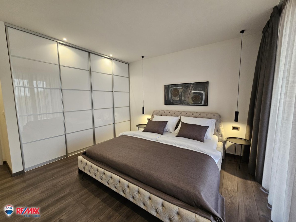 Es bietet zwei geräumige und komfortable Schlafzimmer (18 m2 und 24 m2), jeweils mit eigenem Bad im Zimmer. Das Wohnzimmer, die Küche und das Esszimmer bilden einen offenen Raum mit einem verglasten Kamin, während der Technikraum und die Waschküche geöffnet werden können Der Zugang erfolgt vom Haus aus oder über einen separaten Eingang hinter dem Haus.