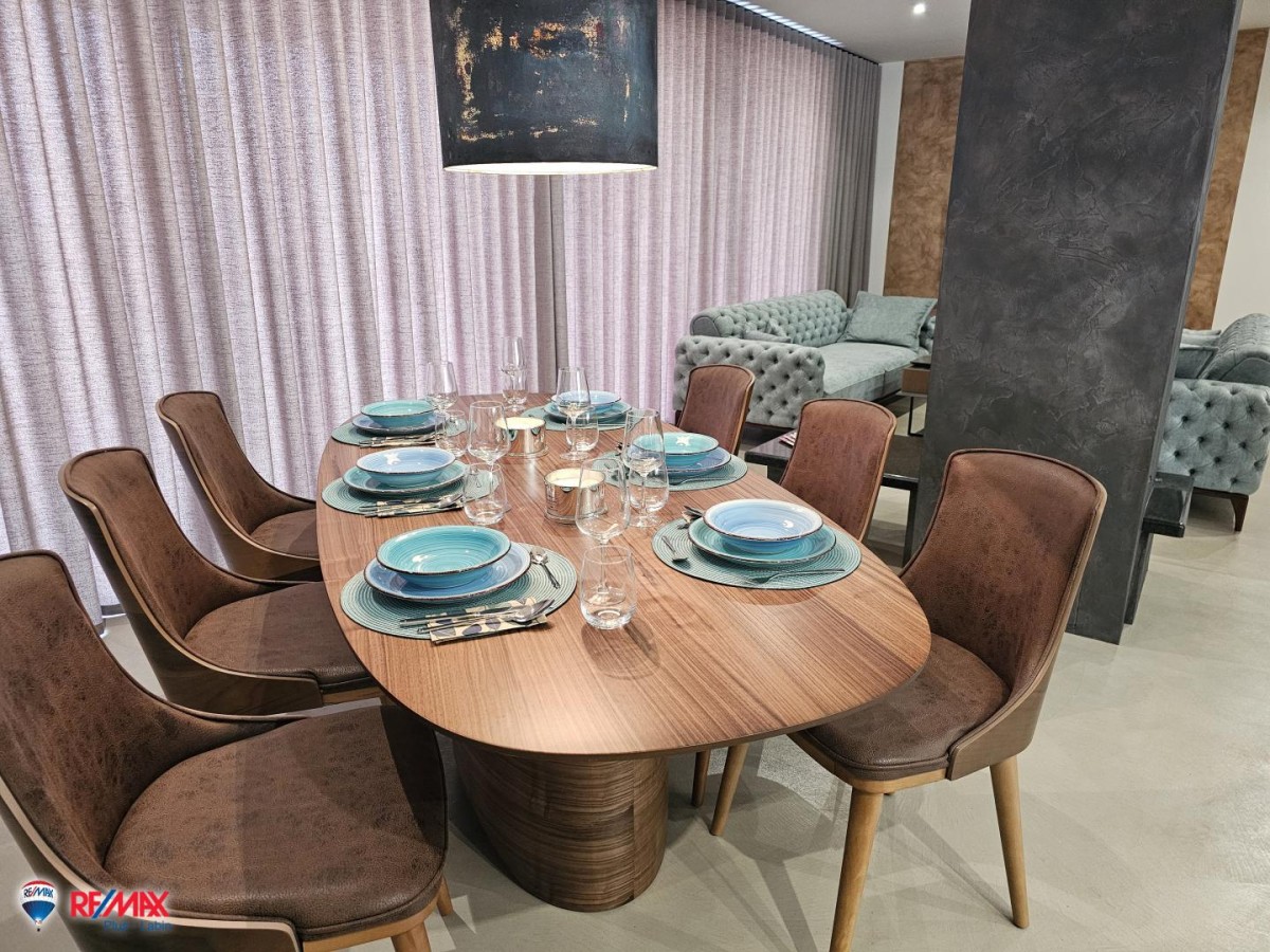 Das Wohnzimmer und die Schlafzimmer führen zu einer großzügigen Außenterrasse, auf der sich ein 48 m² großer Infinity-Außenpool (12 x 4 Meter) befindet. Die Terrasse bietet einen Blick auf das Meer.