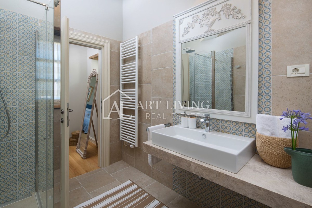 Luxuriöse Steinvilla im istrischen Stil mit einem Swimmingpool von 353 m2 in Zentralistrien, 23 km von Porec und 26 km vom malerischen Rovinj entfernt. Die Villa ist reich ausgestattet und mit Designermöbeln ausgestattet. Die Villa verfügt über einen hohen Komfort und vom Balkon im ersten Stock hat man einen wunderschönen Panoramablick auf das Meer.