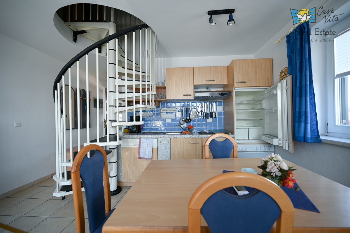 Zum Verkauf steht ein geräumiges Reihenendhaus, das aus einem 28 m2 großen Studio und einer 18 m2 großen Garage im Erdgeschoss sowie einer 55,80 m2 großen Wohnung mit zwei Schlafzimmern im ersten Stock und Dachgeschoss besteht, gelegen in einem ruhigen Teil von Novigrad. Diese Immobilie stellt eine ausgezeichnete Gelegenheit für das Wohnen mit der Familie oder als Investition dar, dank ihrer Funktionalität und Lage.