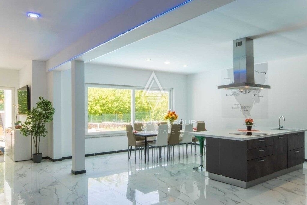 In einem ruhigen Dorf, nur 6 km von Labin und 15 Fahrminuten vom touristischen Zentrum Rabac entfernt, liegt diese beeindruckende Villa, die modernes Design und Energieeffizienz vereint. Erbaut im Jahr 2020, erstreckt sich die Villa über 270 m² auf zwei Etagen und umfasst 4 Schlafzimmer mit privaten Badezimmern, ein Gäste-WC und eine offene Küche mit Kücheninsel, die an einen Essbereich mit Blick auf den Pool grenzt. Das großzügige Wohnzimmer öffnet sich zu einer großen, überdachten Terrasse, ideal zum Entspannen und Unterhalten.