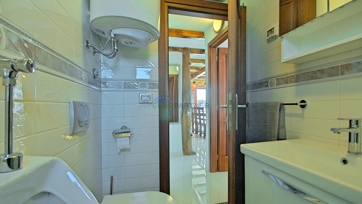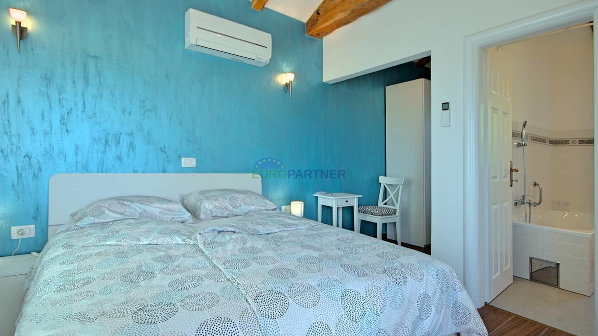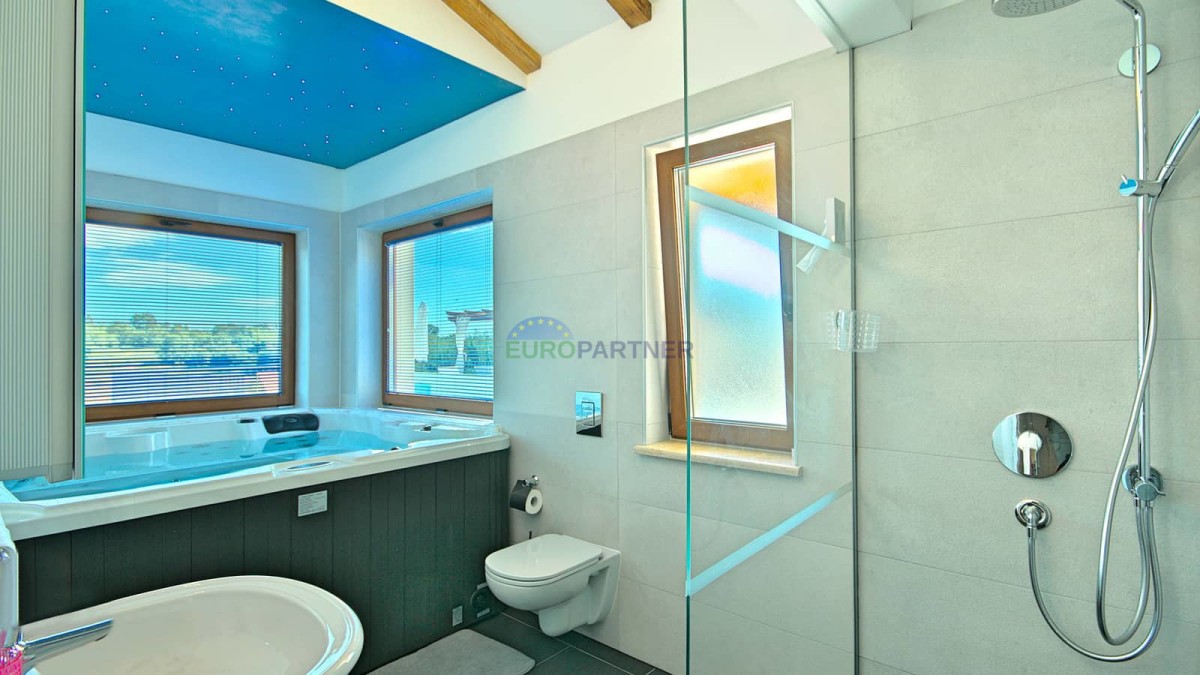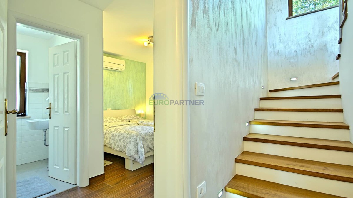 Im Obergeschoss befindet sich das Hauptschlafzimmer mit eigenem Bad, begehbarem Kleiderschrank und Zugang zu einer großen Terrasse – der ideale Ort, um den Morgenkaffee mit Blick auf die istrische Landschaft zu genießen.