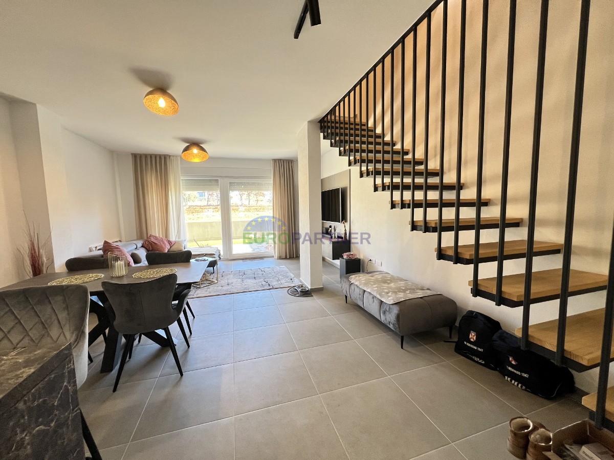 Inhalt der Immobilie: ein geräumiges Wohnzimmer mit Zugang zur Terrasse und privatem Garten, Küche mit Esszimmer, vier Schlafzimmer, zwei moderne Badezimmer und eine zusätzliche Toilette.