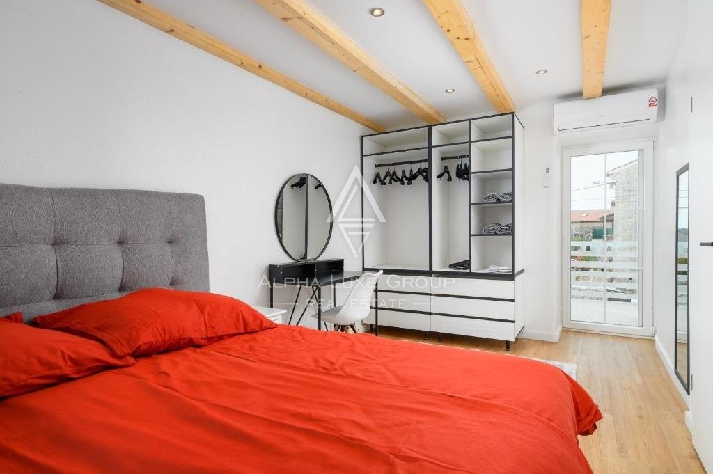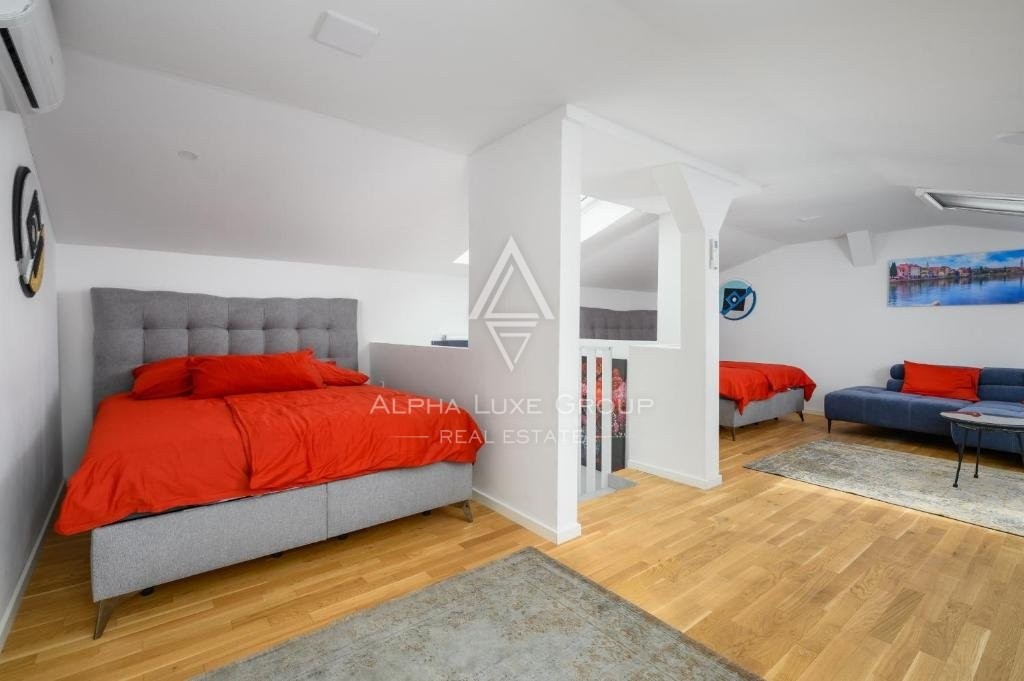 Das Innentreppenhaus wird durch ein großes Dachfenster (180x140 cm) mit Fernbedienung erhellt. Vom Wohnzimmer aus gelangt man direkt auf die Terrasse mit einem Salzwasserpool – ein perfekter Ort zur Entspannung. Die Immobilie ist klimatisiert, mit der Möglichkeit, einen Pelletofen oder einen Holzofen zu installieren. Ein Parkplatz befindet sich direkt vor dem Tor, und alle wichtigen Einrichtungen sind nur wenige Autominuten entfernt.
