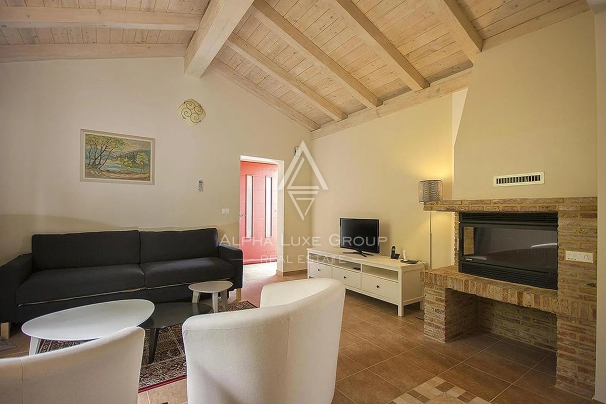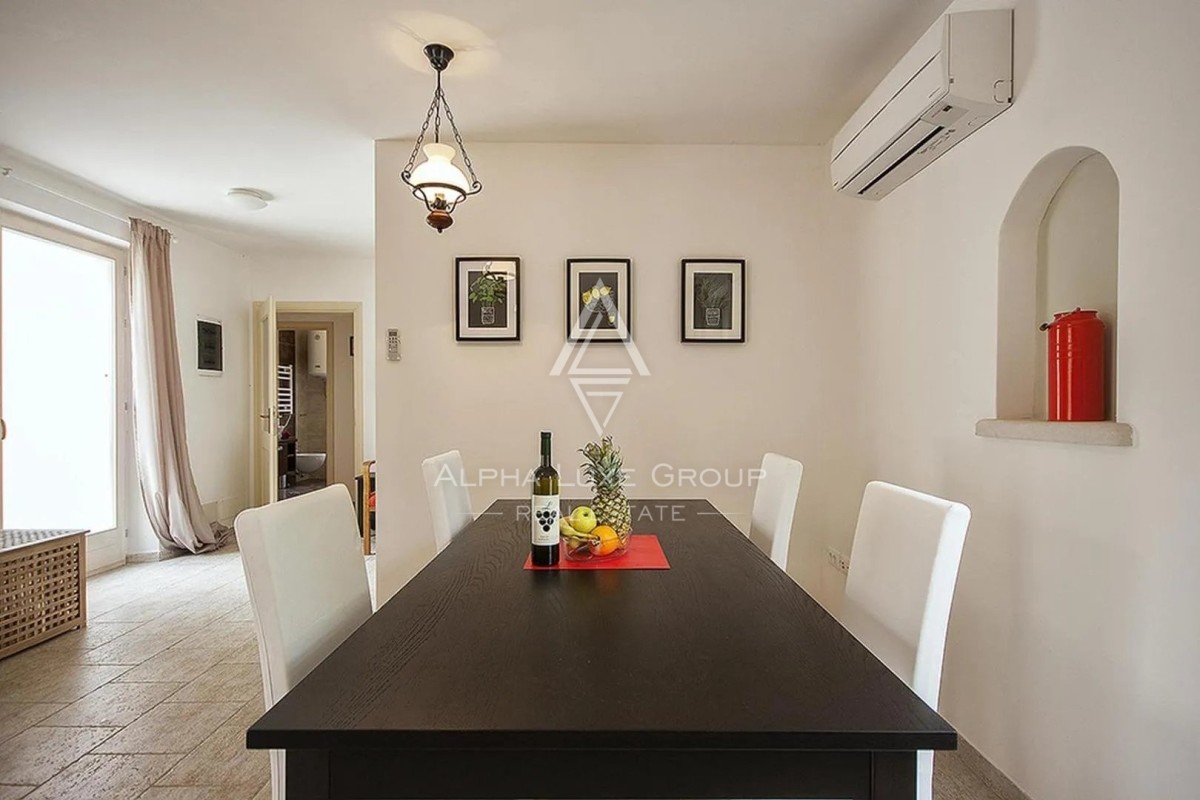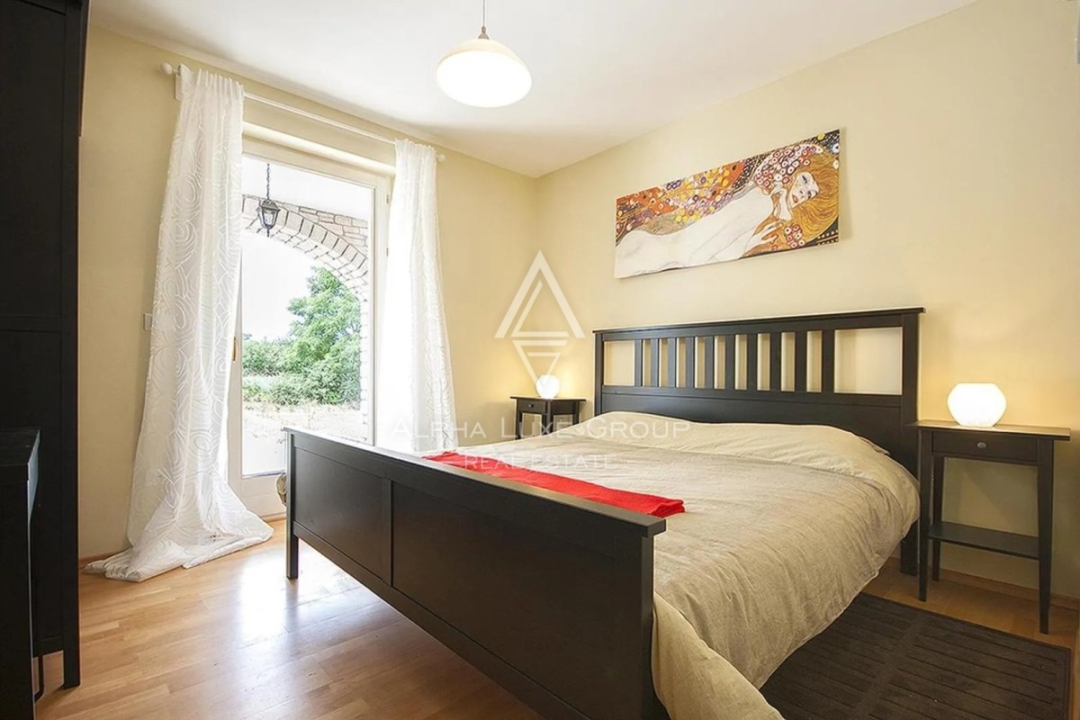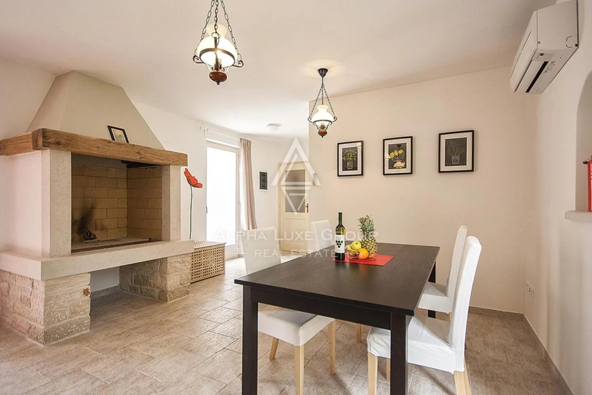 Beide Apartments verfügen über ein gemütliches Wohnzimmer mit einem charmanten Kamin, der in den kälteren Monaten für eine warme und einladende Atmosphäre sorgt. Die rustikale Gestaltung der Villa wird durch die Steinwände und traditionellen Details hervorgehoben, die die authentische Schönheit der istrischen Architektur widerspiegeln.