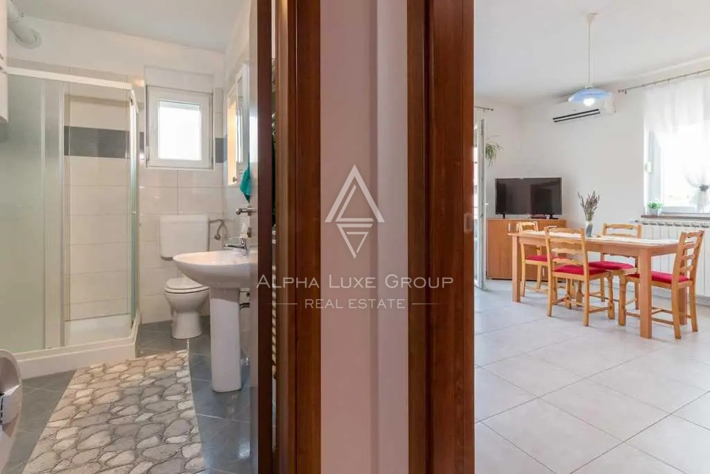 Das Gebäude erstreckt sich über zwei Etagen und umfasst vier gut gestaltete Wohneinheiten. Im Erdgeschoss befinden sich zwei kompakte Apartments, jeweils mit zwei Schlafzimmern, einem Badezimmer, einer Küche, einem Essbereich und einem hellen Wohnzimmer mit direktem Zugang zur Terrasse. Diese Einheiten eignen sich ideal für ganzjähriges Wohnen oder für touristische Vermietung.