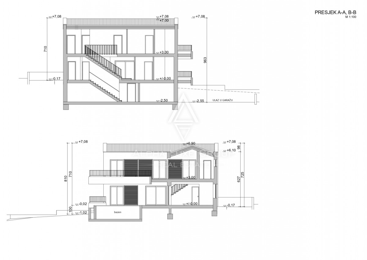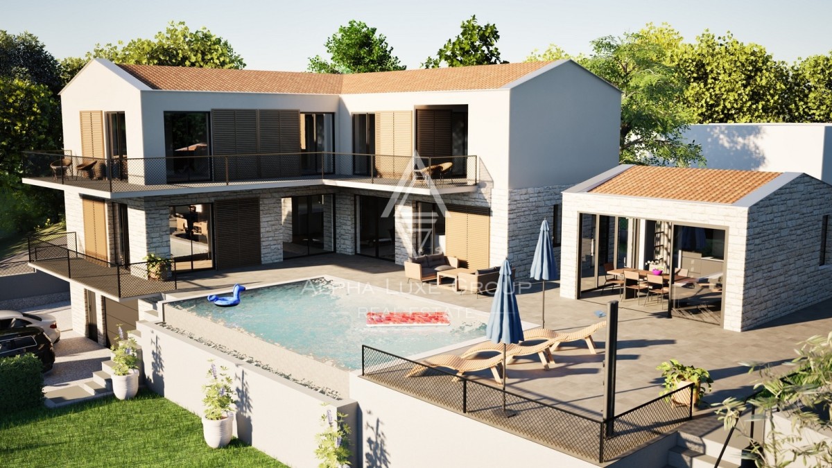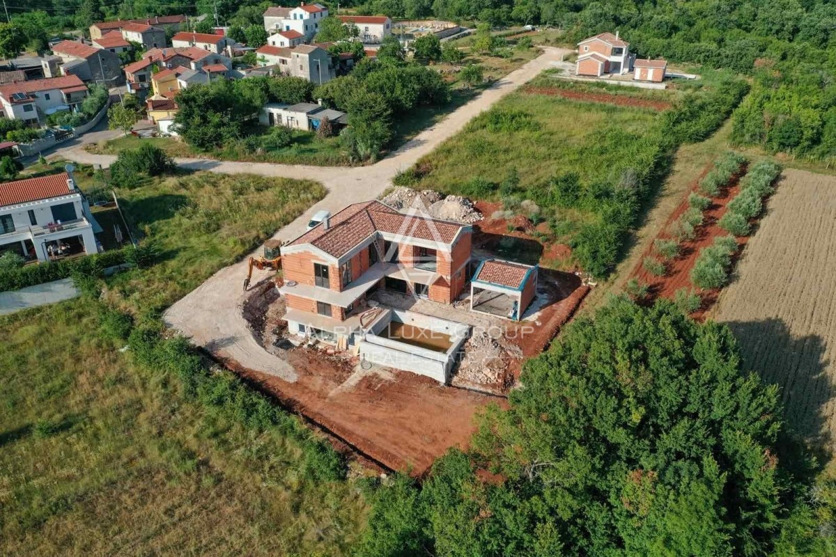 Am Rande eines idyllischen istrischen Dorfes, nur 7 km von Višnjan entfernt, liegt diese neu gebaute Villa, die Luxus, Privatsphäre und Natur perfekt miteinander verbindet. Die Fertigstellung ist für den Sommer 2025 geplant, und die Villa erstreckt sich über drei Etagen: ein Halbuntergeschoss, ein Erdgeschoss und ein Obergeschoss.