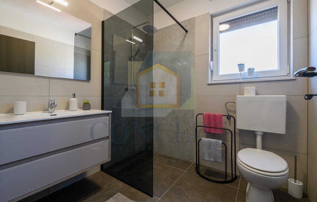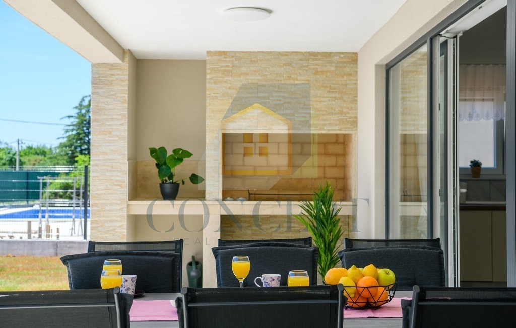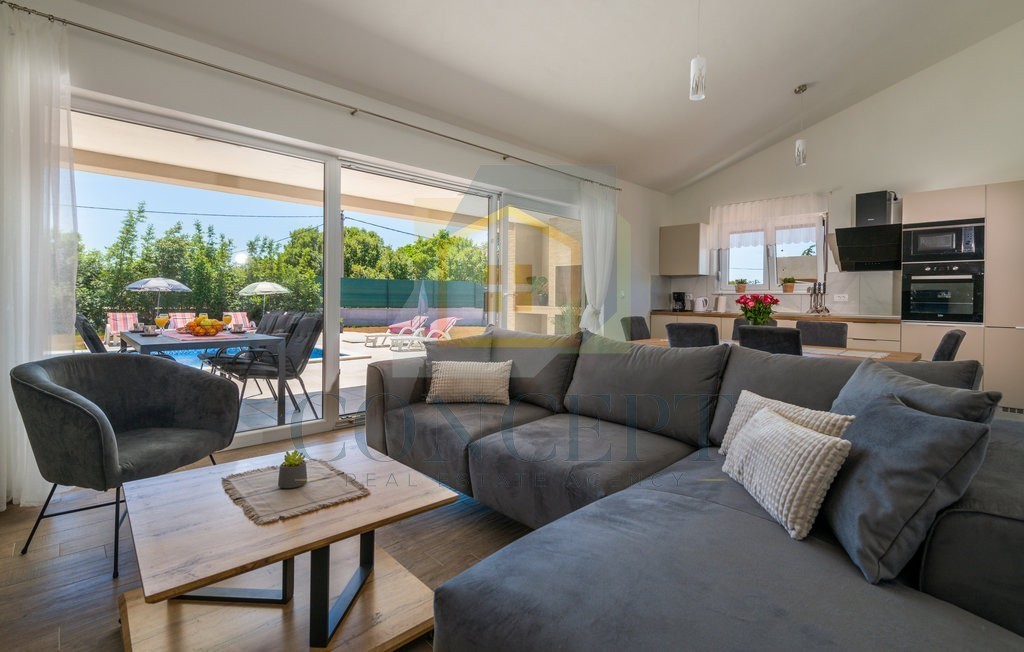 Es besteht aus einem Eingangsflur, einem Wohnzimmer, einer Küche mit Essbereich, drei Schlafzimmern, drei Badezimmern und einem Abstellraum. Die Küche und das Wohnzimmer sind im Open-Space-Konzept verbunden, und dank der Glaswände ist der Raum sonnig und mit Tageslicht durchflutet. Vom Wohnzimmer aus gelangt man auf die überdachte Terrasse und in den Garten, in dem sich ein Pool mit Sonnendeck befindet.