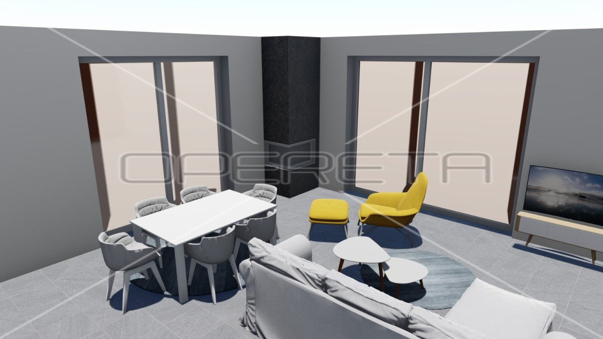 Das Projekt umfasst die Installation von 4 Klimaanlagen, einem Kamin und einem Parkplatz für 2 Fahrzeuge.