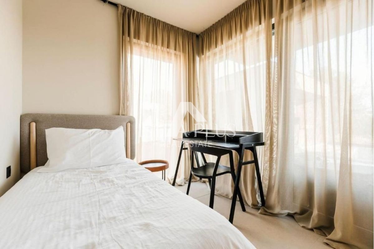 Das Erdgeschoss besteht aus einer Eingangshalle, einer Küche mit Esszimmer und Wohnzimmer, einem Schlafzimmer und einer Gästetoilette. Große Glaswände erstrecken sich über die gesamte Wand und geben stets den Blick auf die Außenterrasse mit Pool frei. Dank der großen Menge an natürlichem Licht ist der Raum äußerst luftig und angenehm zum Verweilen. Im ersten Stock der Villa befinden sich drei Schlafzimmer, jedes mit eigenem Bad. Alle Zimmer haben Zugang zu einem eigenen Balkon, der ein Höchstmaß an Privatsphäre und Komfort gewährleistet. Verglaste Badezimmerwände, neutrale Innenfarben und gläserne Balkongeländer verleihen den Schlafzimmern ein besonderes Erscheinungsbild.