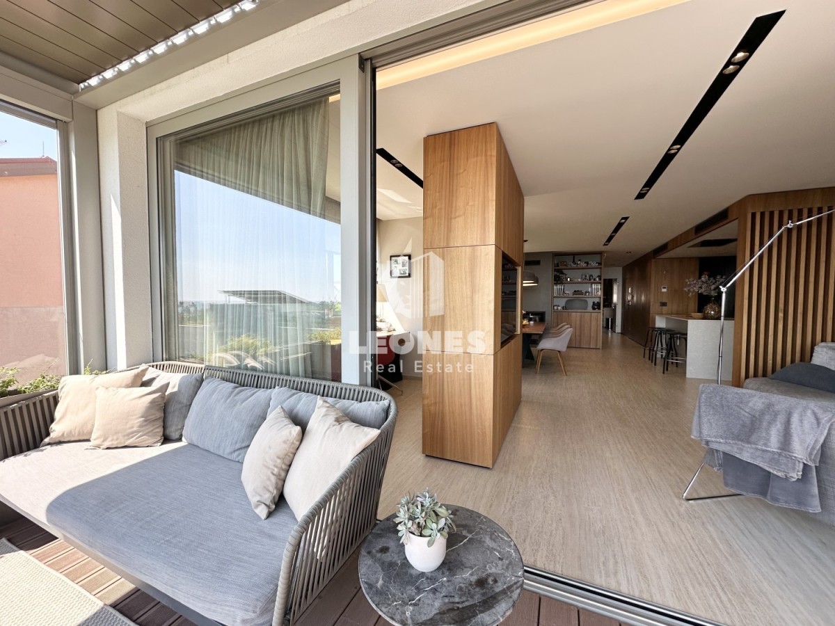Das geräumige Wohnzimmer mit großen Glaswänden öffnet sich zu einer Terrasse mit einem bezaubernden, unverbauten Blick auf das Meer, ideal, um die Sonnenuntergänge zu genießen und zu entspannen. Die Glaswand verfügt über ALU-Profile mit Wärmedämmung und einer zentralen Öffnung von 3,75 Metern.