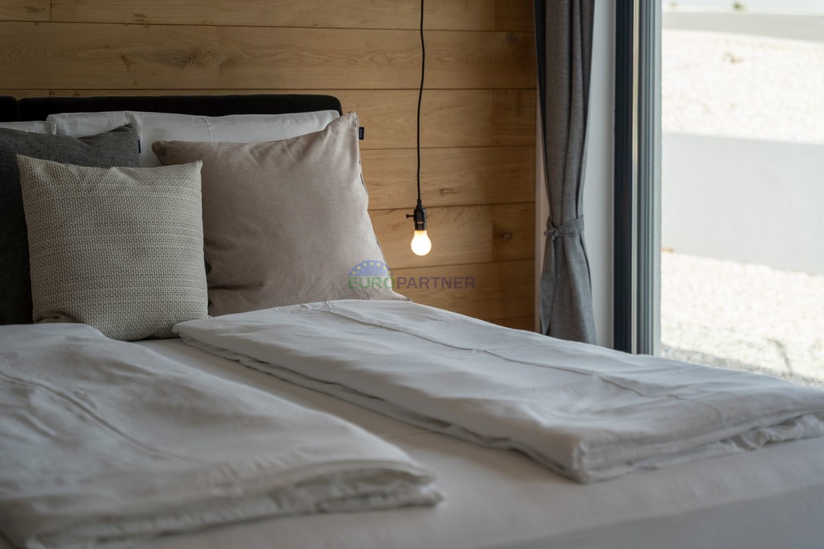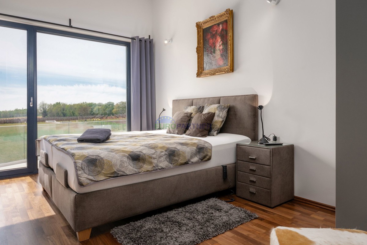 Das Design der Villa besticht durch große Fenster im gesamten Gebäude, die viel natürliches Licht in die Innenräume lassen und atemberaubende Ausblicke auf die umliegenden Felder und Wälder bieten. Die geräumigen Wohnbereiche verschmelzen nahtlos mit der Außenwelt und bringen die Schönheit der Natur direkt in Ihr Zuhause.