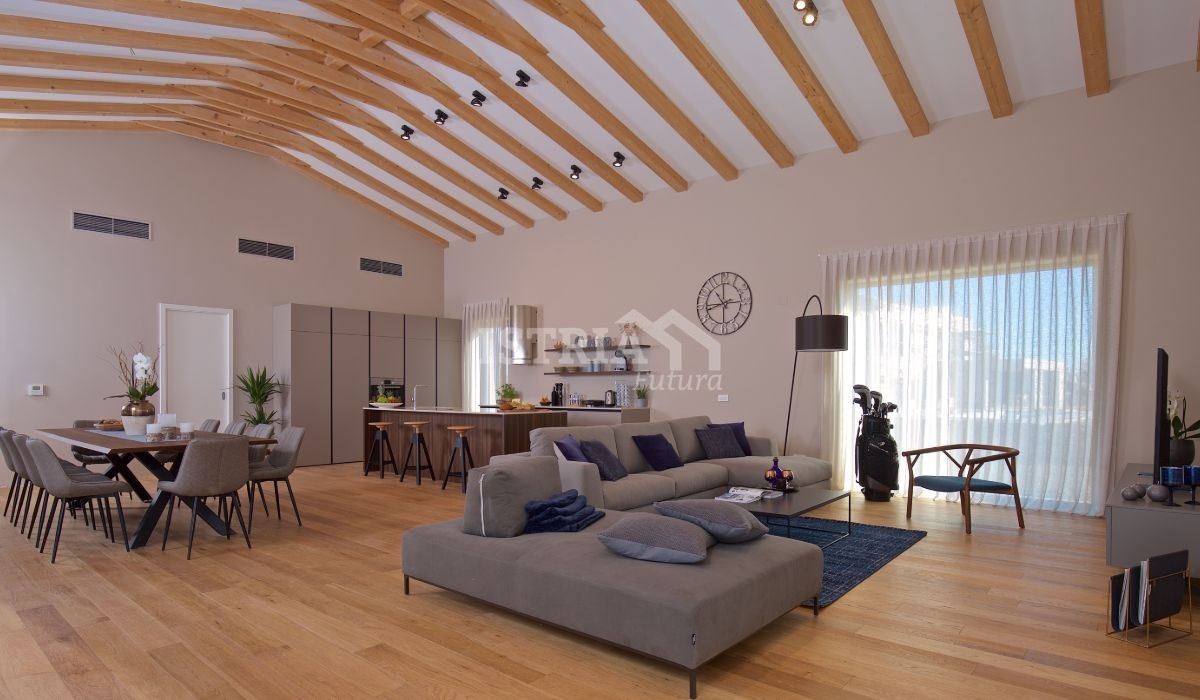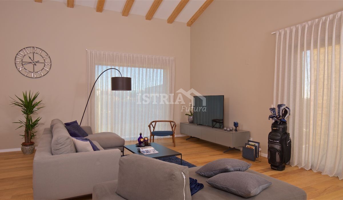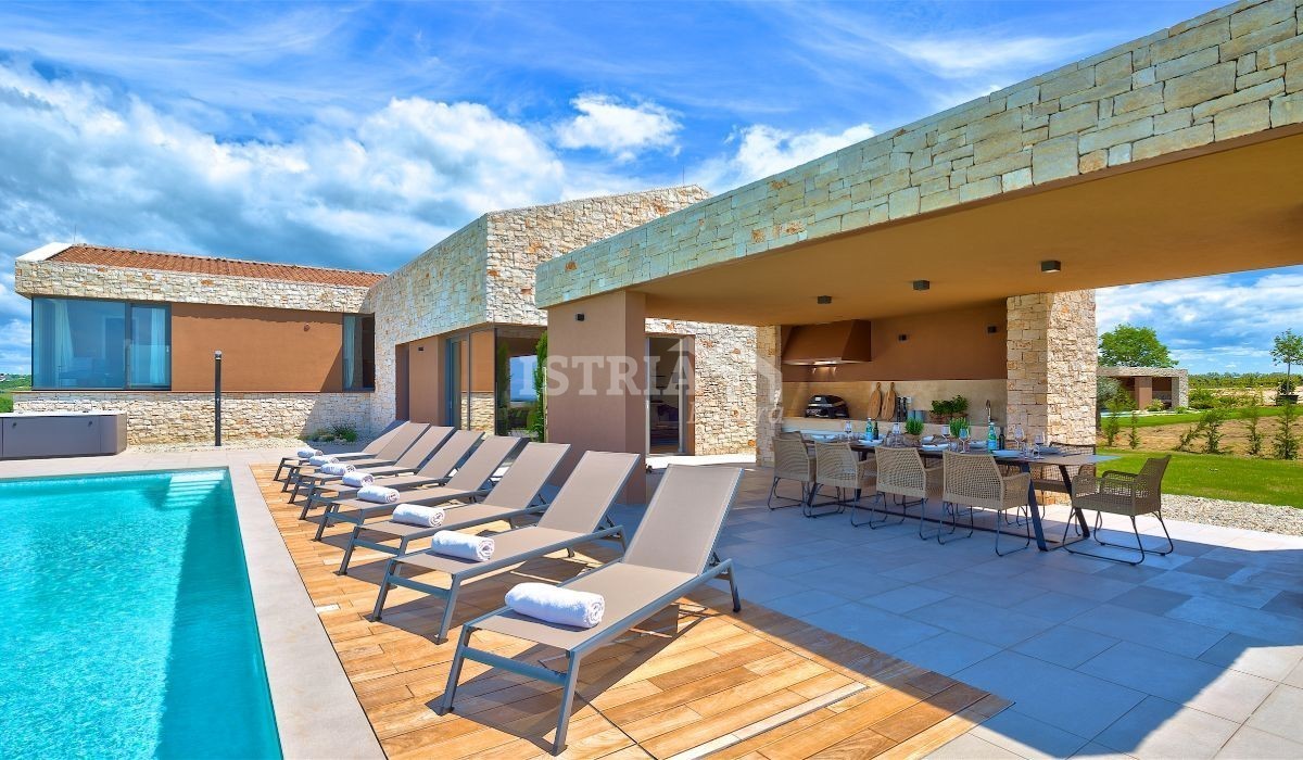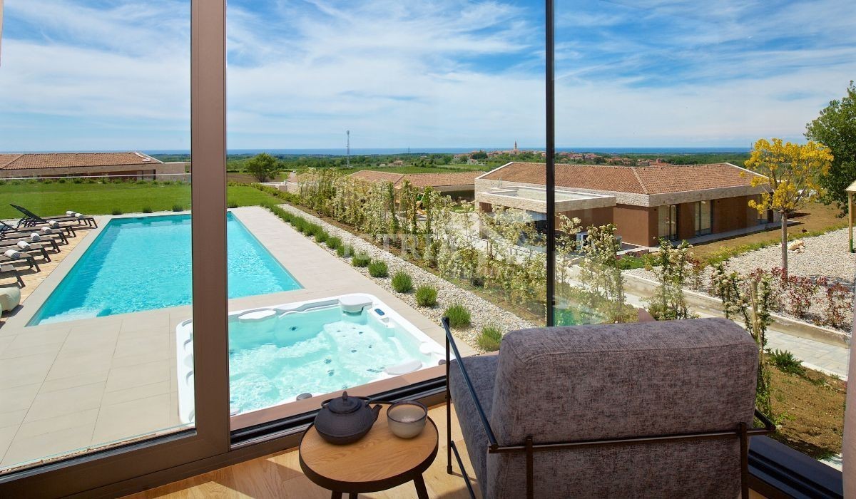 Zum Verkauf steht eine wunderschöne Luxusvilla mit modernem Design von 375 m2, die sich auf einem wunderschönen Hügel oberhalb von Brtonigla befindet, von dem aus einer der schönsten Ausblicke auf das Meer, Brtonigla und die istrische Landschaft zu sehen ist.