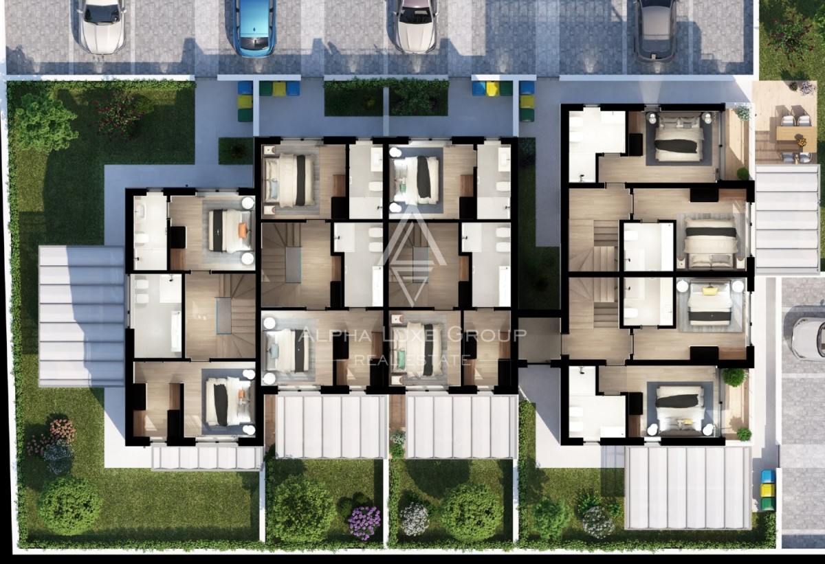 Das Erdgeschoss empfängt Sie mit einer Eingangshalle und Garderobe, die zu einem geräumigen Wohnbereich führt, der eine Küche und einen Essbereich integriert. Diese Etage bietet auch einen Waschraum, eine Gästetoilette und einen Technikraum. Glaswände im Wohnbereich ermöglichen den Zugang zu einer überdachten Terrasse, die eine nahtlose Verbindung zum Außengarten schafft. Das zweite Stockwerk verfügt über zwei große Schlafzimmer, jedes mit einem eigenen Badezimmer, wobei ein Schlafzimmer auch einen persönlichen Kleiderschrank von 6,25 m2 umfasst. Die Reise führt weiter in das dritte Stockwerk, das ein zusätzliches Schlafzimmer mit einem Badezimmer und Zugang zu einer ausgedehnten Terrasse beherbergt. Die Residenz ist mit modernster Fußbodenheizung, betrieben durch eine Wärmepumpe, und Klimaanlagen ausgestattet.