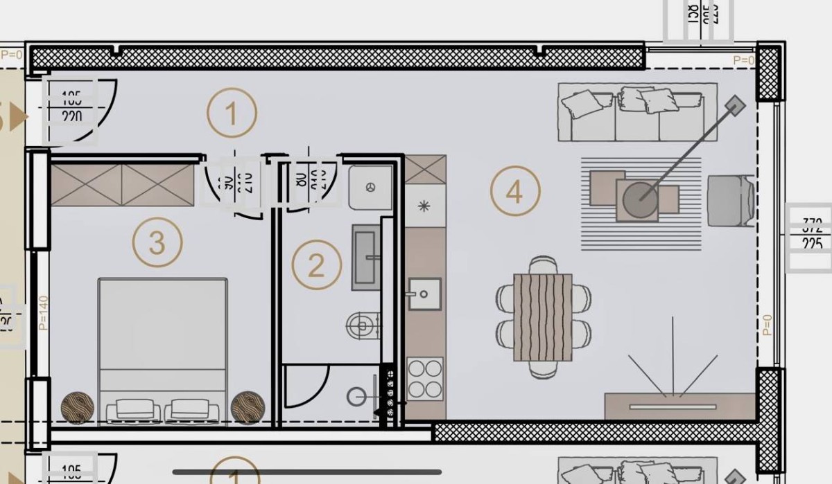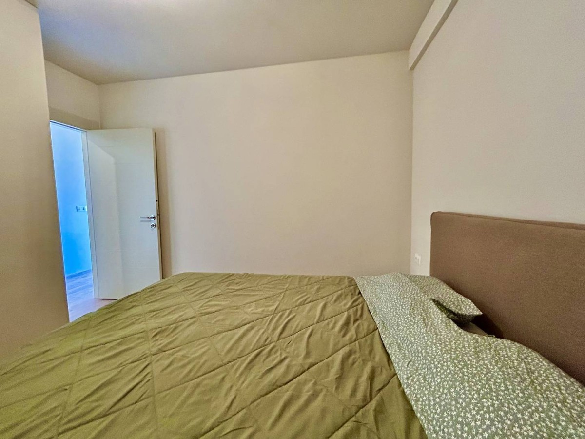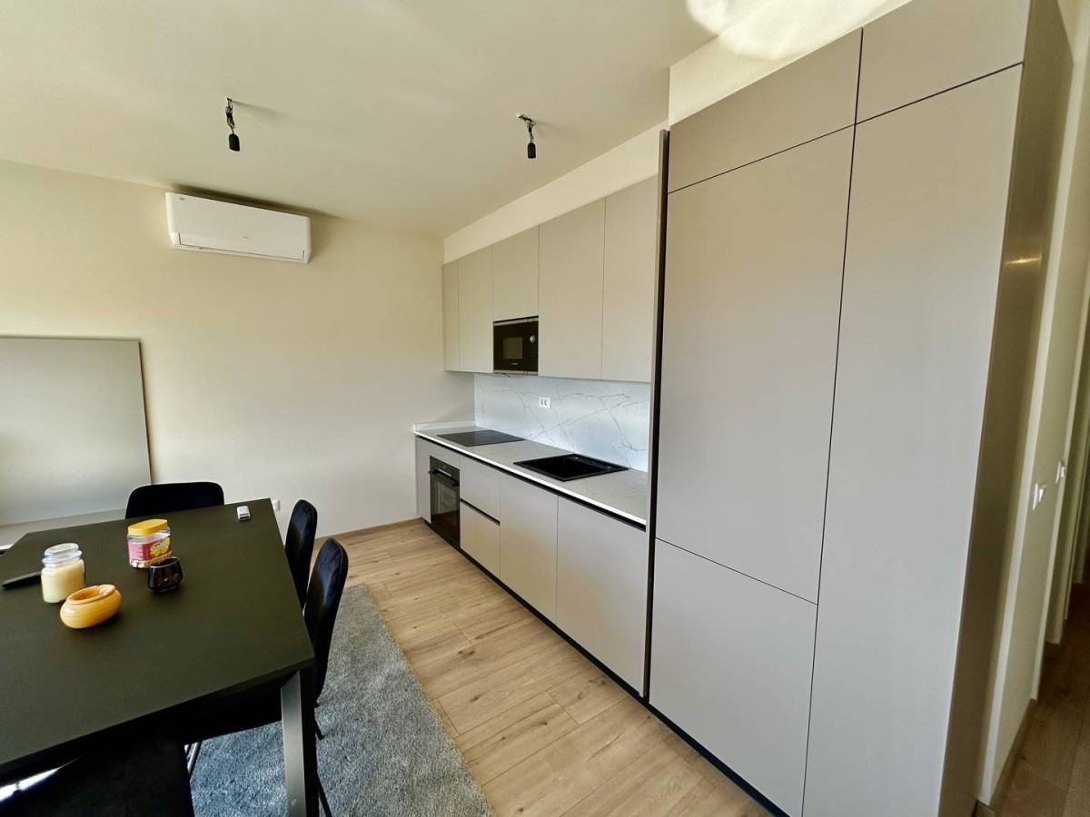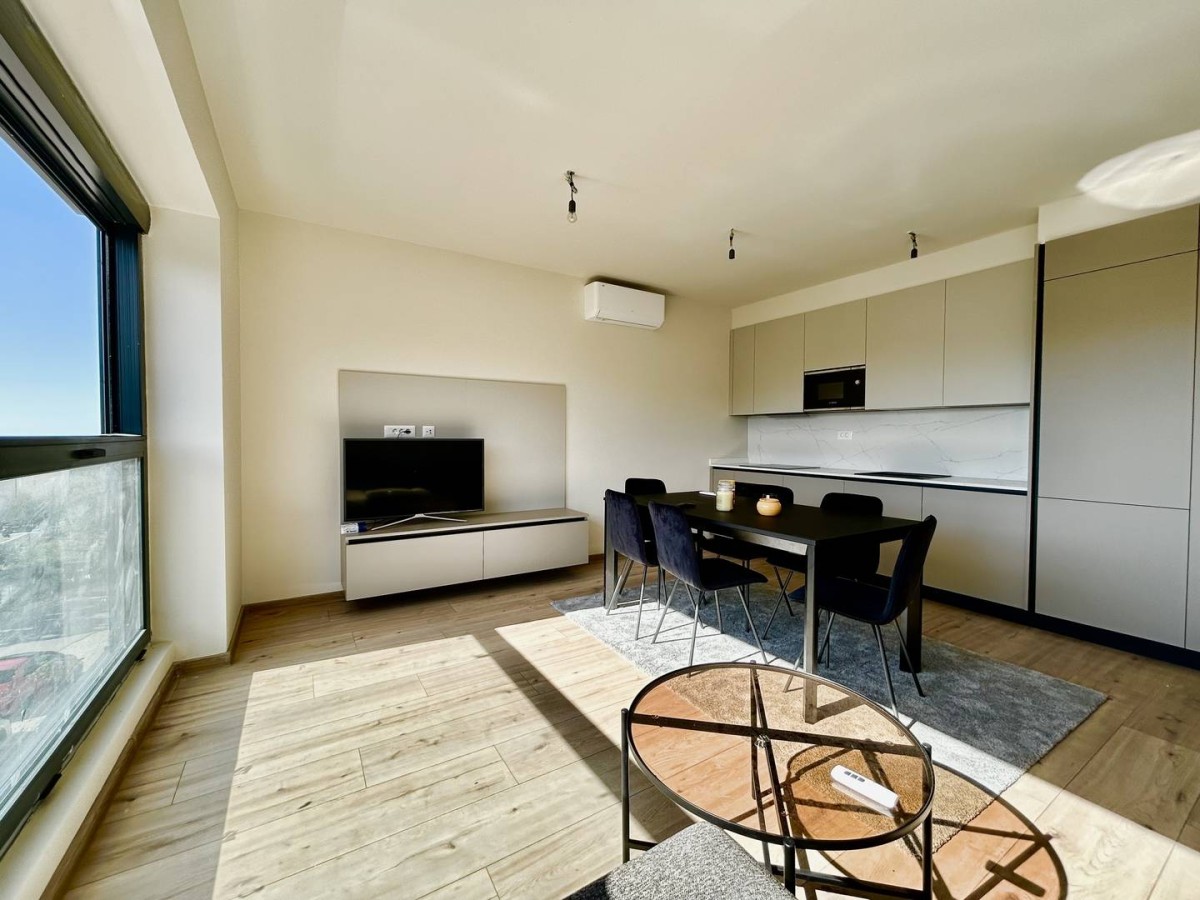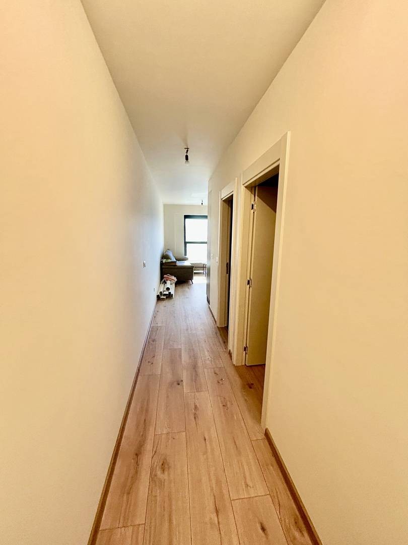 Die Wohnung ist neu und besteht aus einem Eingangsflur, einer offenen Küche mit Essbereich und Wohnzimmer, einem Schlafzimmer und einem Badezimmer.