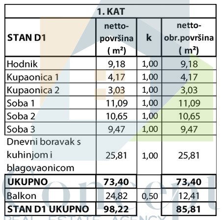 Die Wohnung hat eine Fläche von 85,81 m² und besteht aus einem Eingangsflur, drei Schlafzimmern, zwei Badezimmern sowie einem geräumigen Wohnzimmer mit Küche und Essbereich, von dem man auf einen großen Balkon von fast 25 m² gelangt.
