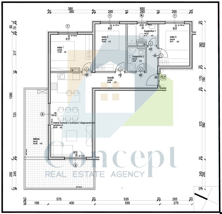 Die Wohnung hat eine Fläche von 85,81 m² und besteht aus einem Eingangsflur, drei Schlafzimmern, zwei Badezimmern sowie einem großzügigen Wohnzimmer mit Küche und Essbereich, von dem aus man auf einen großen Balkon von fast 25 m² gelangt.
