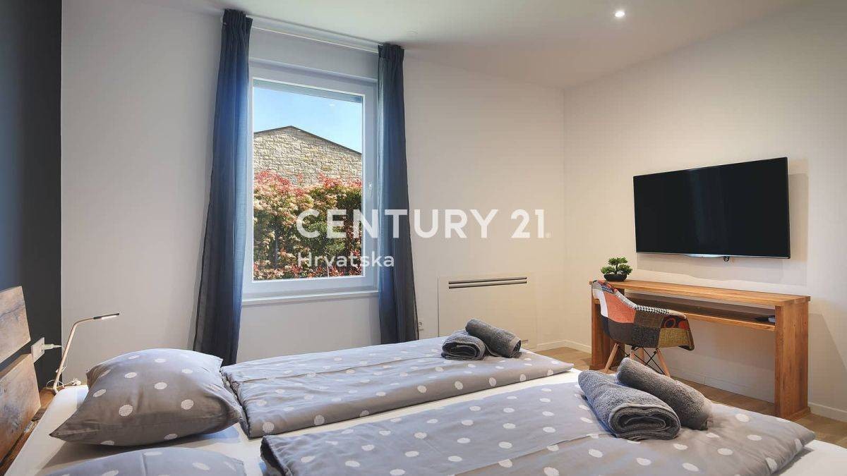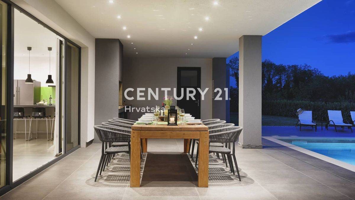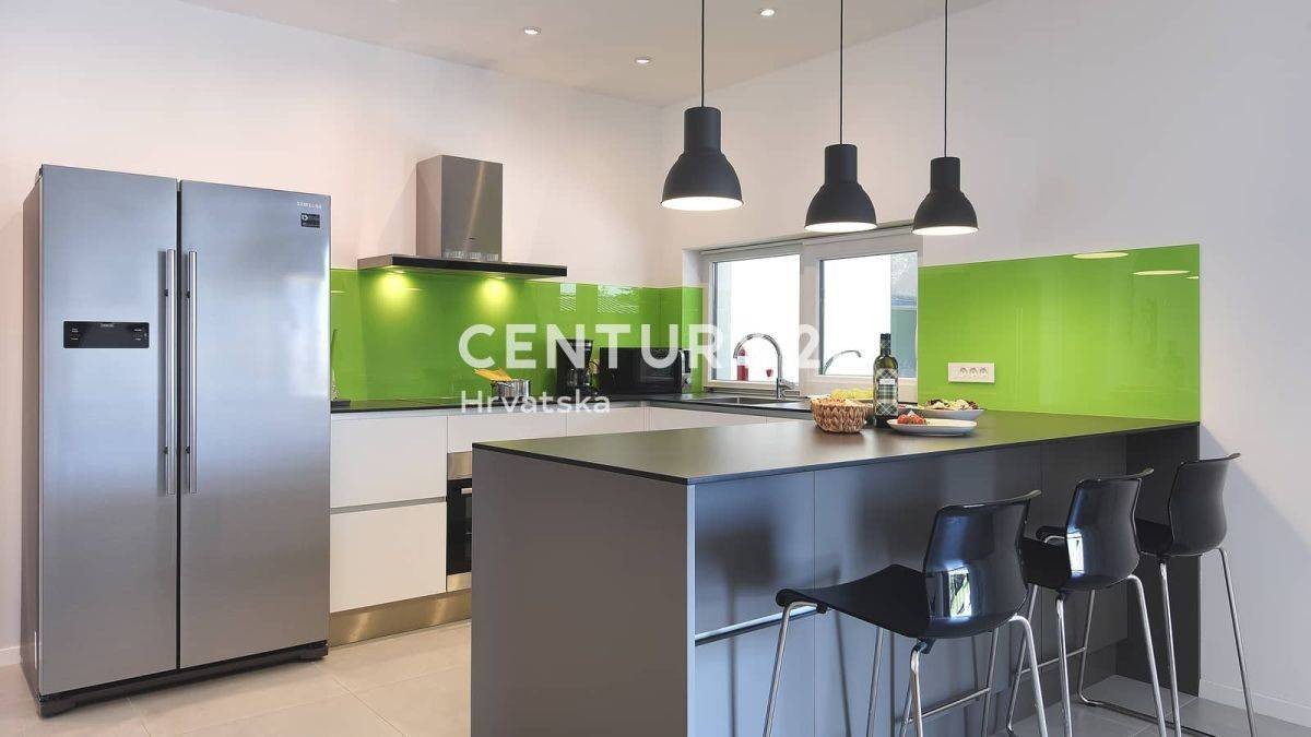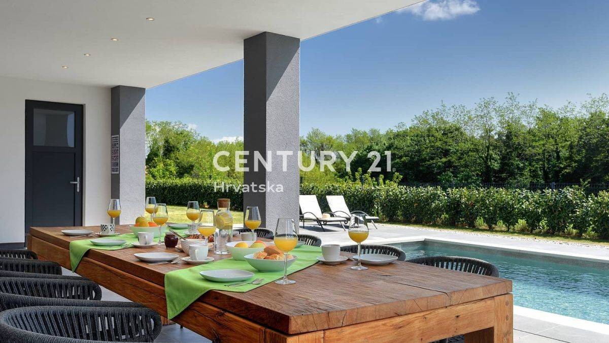 Dieses schöne moderne einstöckige Haus liegt in einer ruhigen Gegend, am Ende der Bauzone in Svetvinčent.