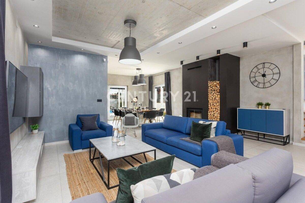 In allen Räumen sind Klimaanlagen installiert, in den Badezimmern Fußbodenheizung und im Wohnzimmer gibt es auch einen großen Holzkamin.