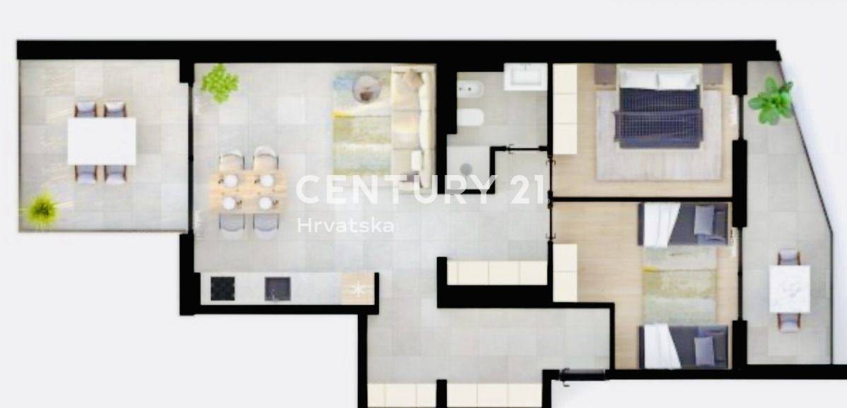 Es besteht aus einer Eingangshalle, einem Wohnzimmer mit offener Küche und Esszimmer, zwei Schlafzimmer und einem Badezimmer.