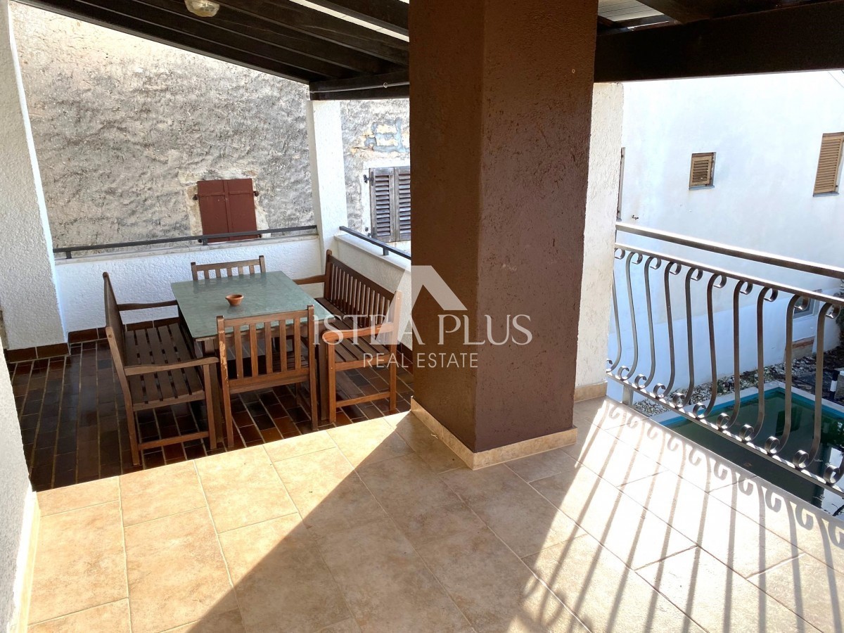 Im Erdgeschoss gibt es eine Taverne mit Toilette und Abstellraum, einen Raum mit Küche (zur Bewirtung oder nach Wunsch arrangierbar) und einen weiteren Abstellraum sowie eine überdachte Terrasse und einen überdachten Bereich, der zum Hof führt mit Liegewiese und Schwimmbad.