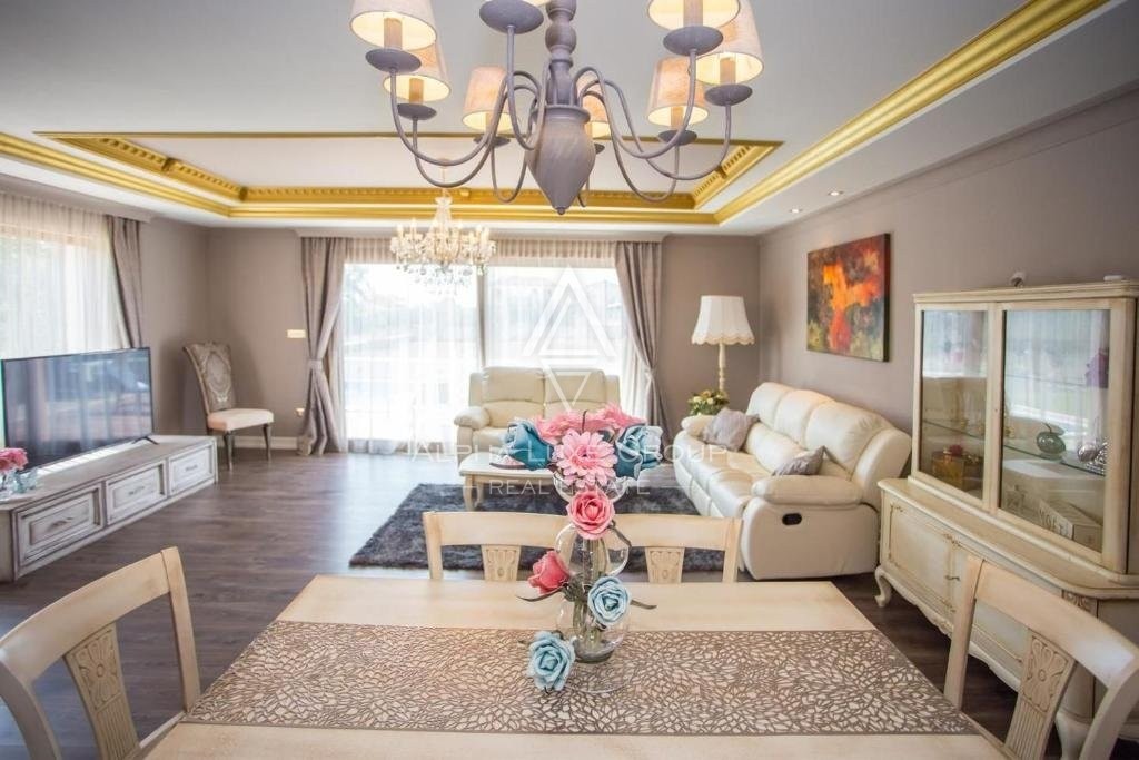 Vom Wohnzimmer aus gibt es eine Terrasse, die zu einem wunderschön angelegten Garten führt, in dem sich ein Swimmingpool mit Schwimmbecken befindet.
