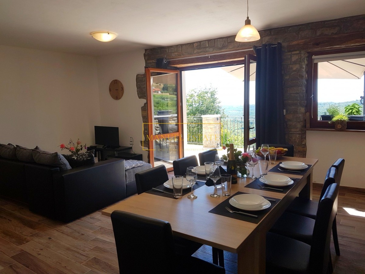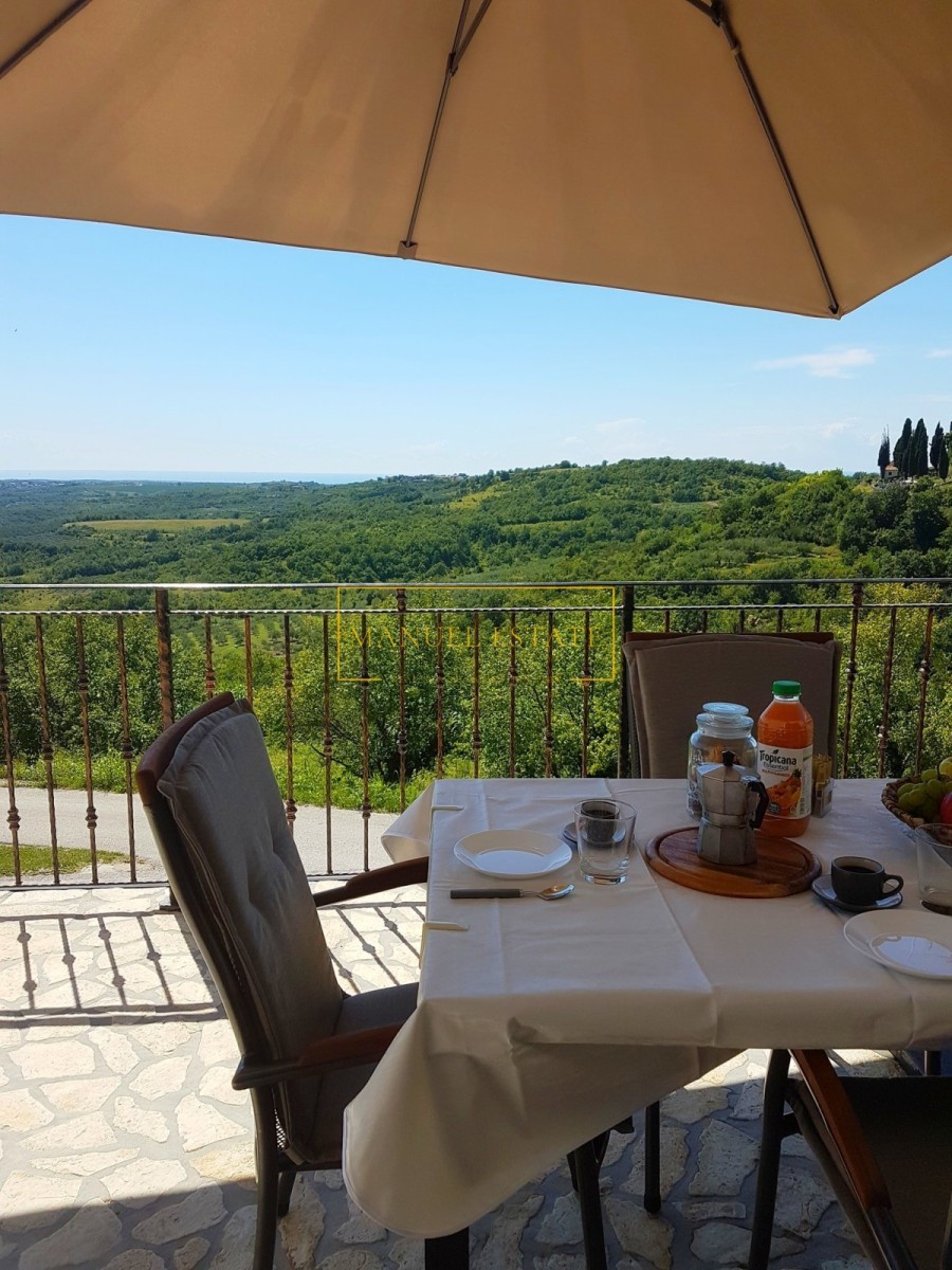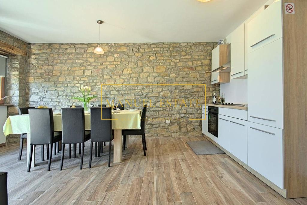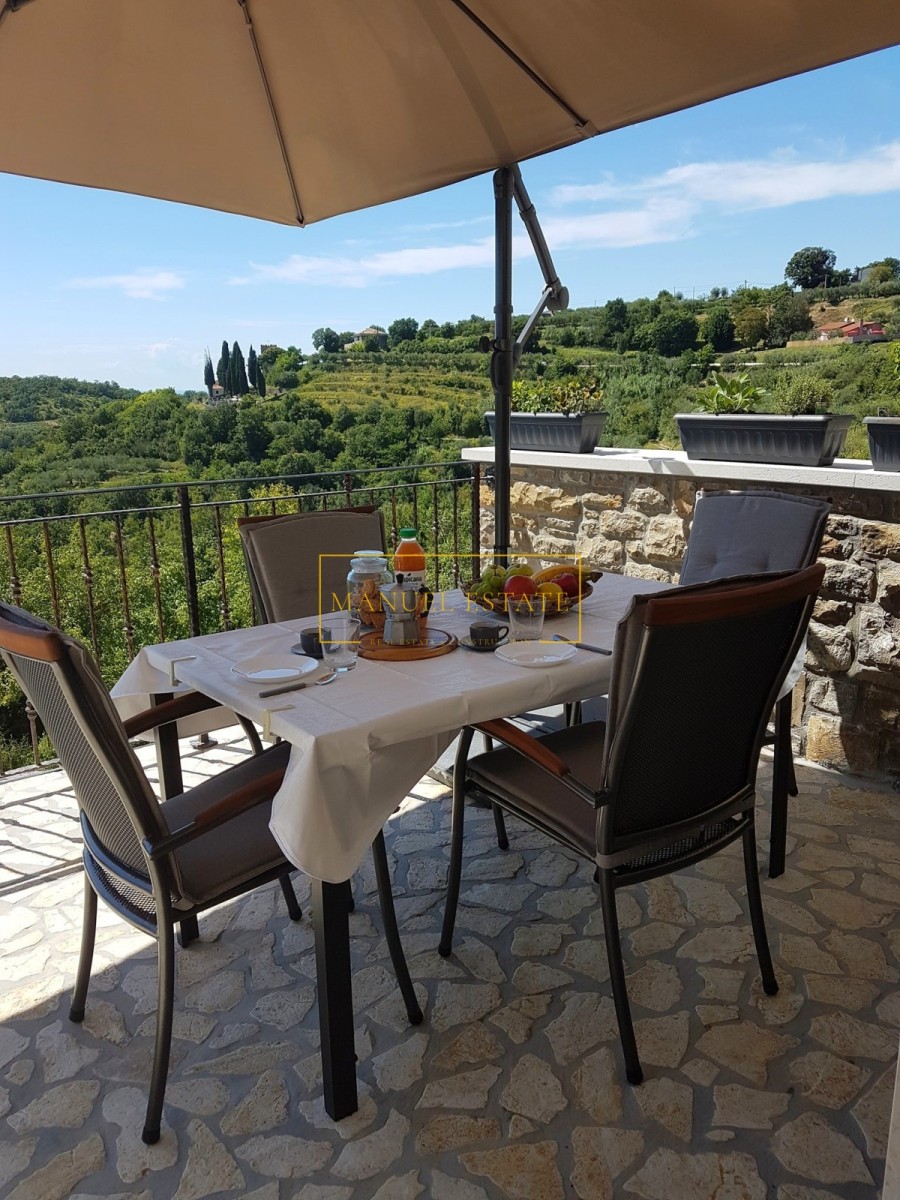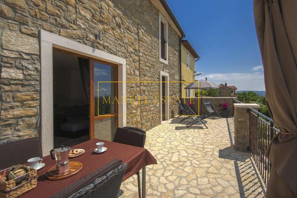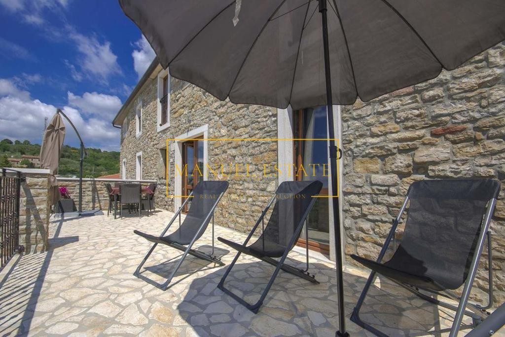 Renoviertes autochthones istrisches Steinhaus in ruhiger Lage mit Panoramablick auf die Landschaft und das Meer, in der Nähe von Buje, Gesamtwohnfläche von 127 m2. Es erstreckt sich über drei Etagen, im Erdgeschoss befindet sich eine Taverne und im ersten Stock von 70 m2 befinden sich zwei Schlafzimmer, ein Badezimmer, eine Küche + ein Esszimmer + ein Wohnzimmer mit Zugang zu einer großen Terrasse mit einem wunderbarer Blick ins Grüne und in die Natur. Im zweiten Stock des Hauses gibt es einen zusätzlichen Raum von 70 m2, der angepasst werden muss. Heizung/Kühlung: Klimaanlagen. Ein Steinhaus mit vielen Details, perfekt für Ihr neues Zuhause oder als Feriendomizil, oder als Mietinvestition und zusätzliches Einkommen. Für alle weiteren Informationen können Sie uns gerne kontaktieren.
