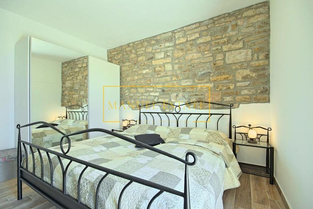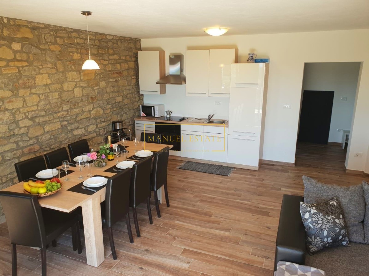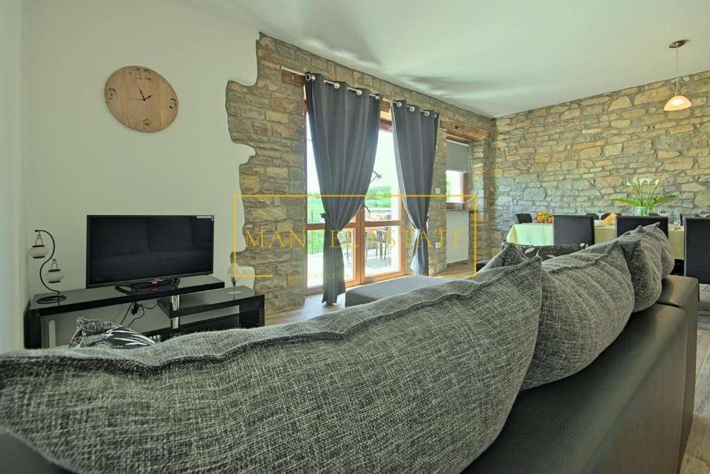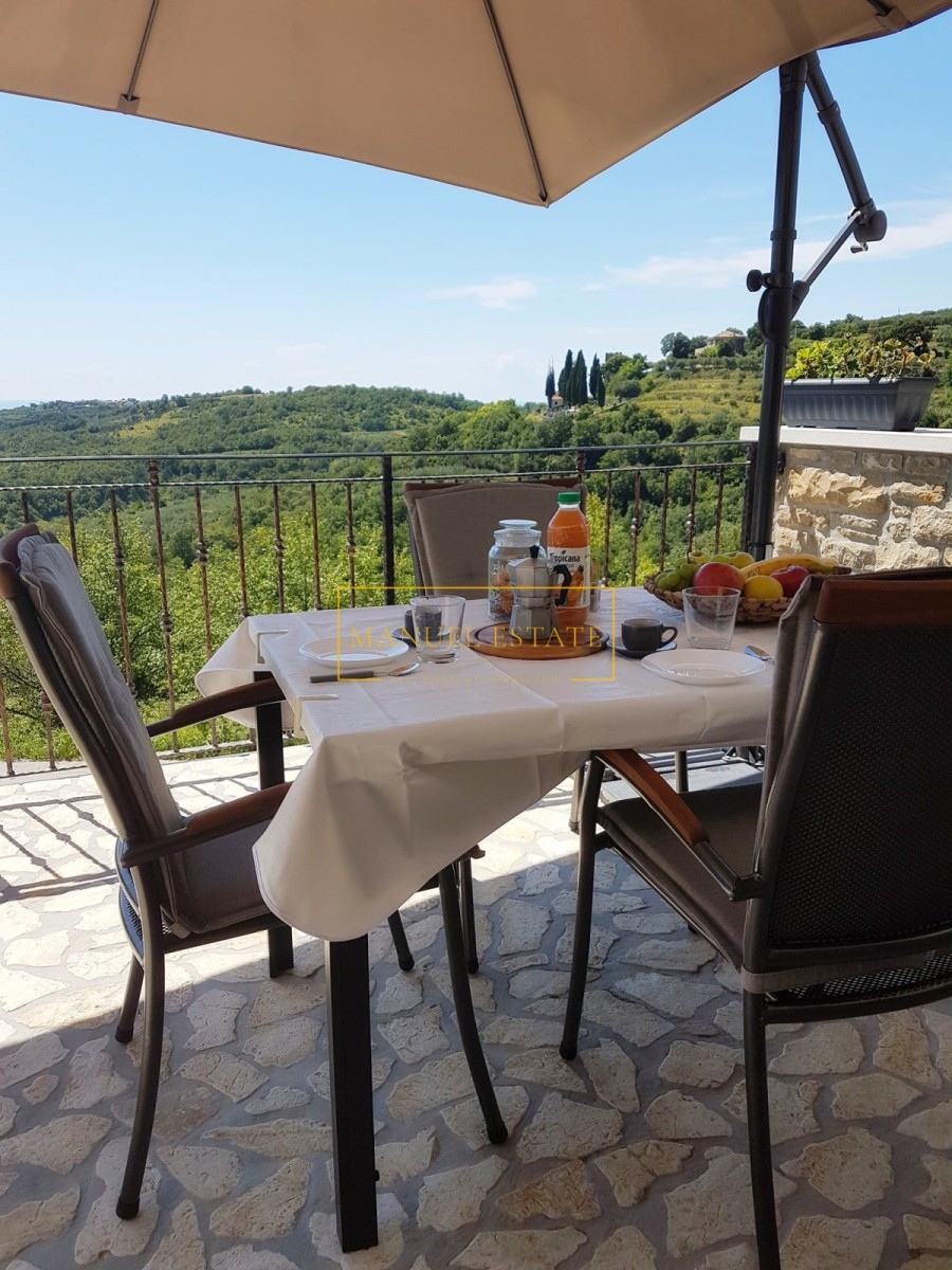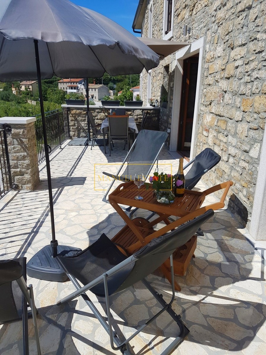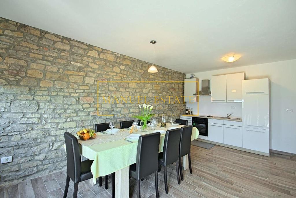 Renoviertes autochthones istrisches Steinhaus in ruhiger Lage mit Panoramablick auf die Landschaft und das Meer, in der Nähe von Buje, Gesamtwohnfläche von 127 m2. Es erstreckt sich über drei Etagen, im Erdgeschoss befindet sich eine Taverne und im ersten Stock von 70 m2 befinden sich zwei Schlafzimmer, ein Badezimmer, eine Küche + ein Esszimmer + ein Wohnzimmer mit Zugang zu einer großen Terrasse mit einem wunderbarer Blick ins Grüne und in die Natur. Im zweiten Stock des Hauses gibt es einen zusätzlichen Raum von 70 m2, der angepasst werden muss. Heizung/Kühlung: Klimaanlagen. Ein Steinhaus mit vielen Details, perfekt für Ihr neues Zuhause oder als Feriendomizil, oder als Mietinvestition und zusätzliches Einkommen. Für alle weiteren Informationen können Sie uns gerne kontaktieren.