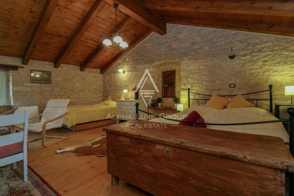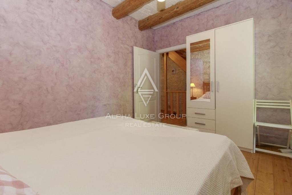 Dieses beeindruckende Steinhaus erstreckt sich über 136 m² Wohnfläche auf drei Etagen und besticht durch ein harmonisches Design mit viel natürlichem Licht und einer warmen, einladenden Atmosphäre. Im Erdgeschoss befindet sich ein offener Wohnbereich mit Küche und Essbereich, der direkt auf die überdachte Terrasse führt, die einen Blick auf den Pool und den großzügigen Innenhof bietet. Eine Holztreppe führt in das erste Obergeschoss, wo sich zwei gemütliche Schlafzimmer mit Doppelbetten und ein Badezimmer mit Dusche befinden.