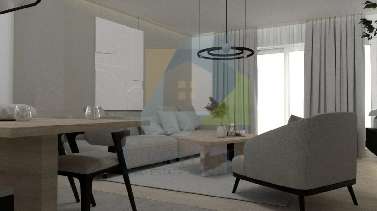 Die Wohnung hat eine Gesamtfläche von 83,22 m² und setzt sich aus einem Eingangsflur, einem Utility-Raum, einem modernen Badezimmer, zwei Schlafzimmern sowie einem geräumigen Wohnzimmer zusammen, das mit der Küche und dem Essbereich verbunden ist. Vom Wohnbereich aus gelangt man auf eine praktische Terrasse mit einer Fläche von 10,37 m², von der aus man einen Blick auf das Meer hat.