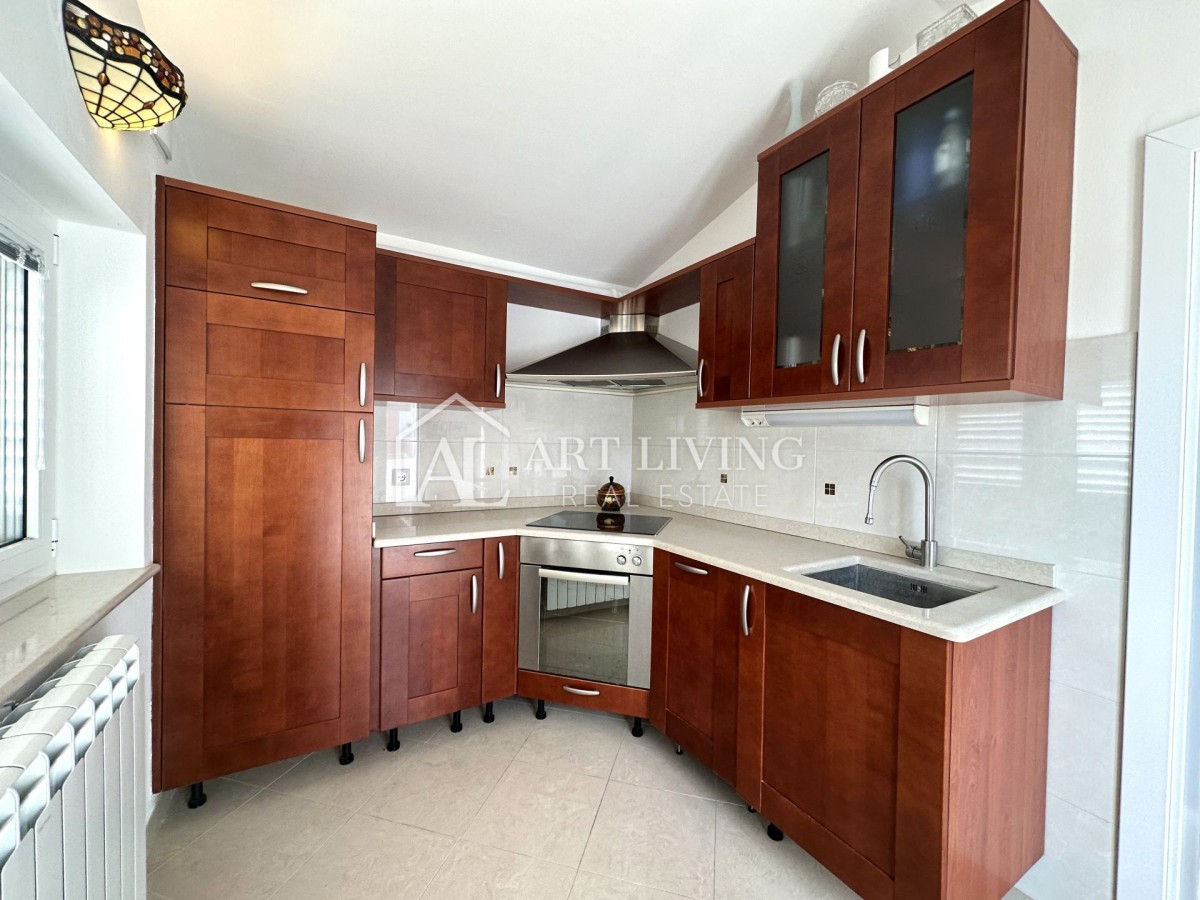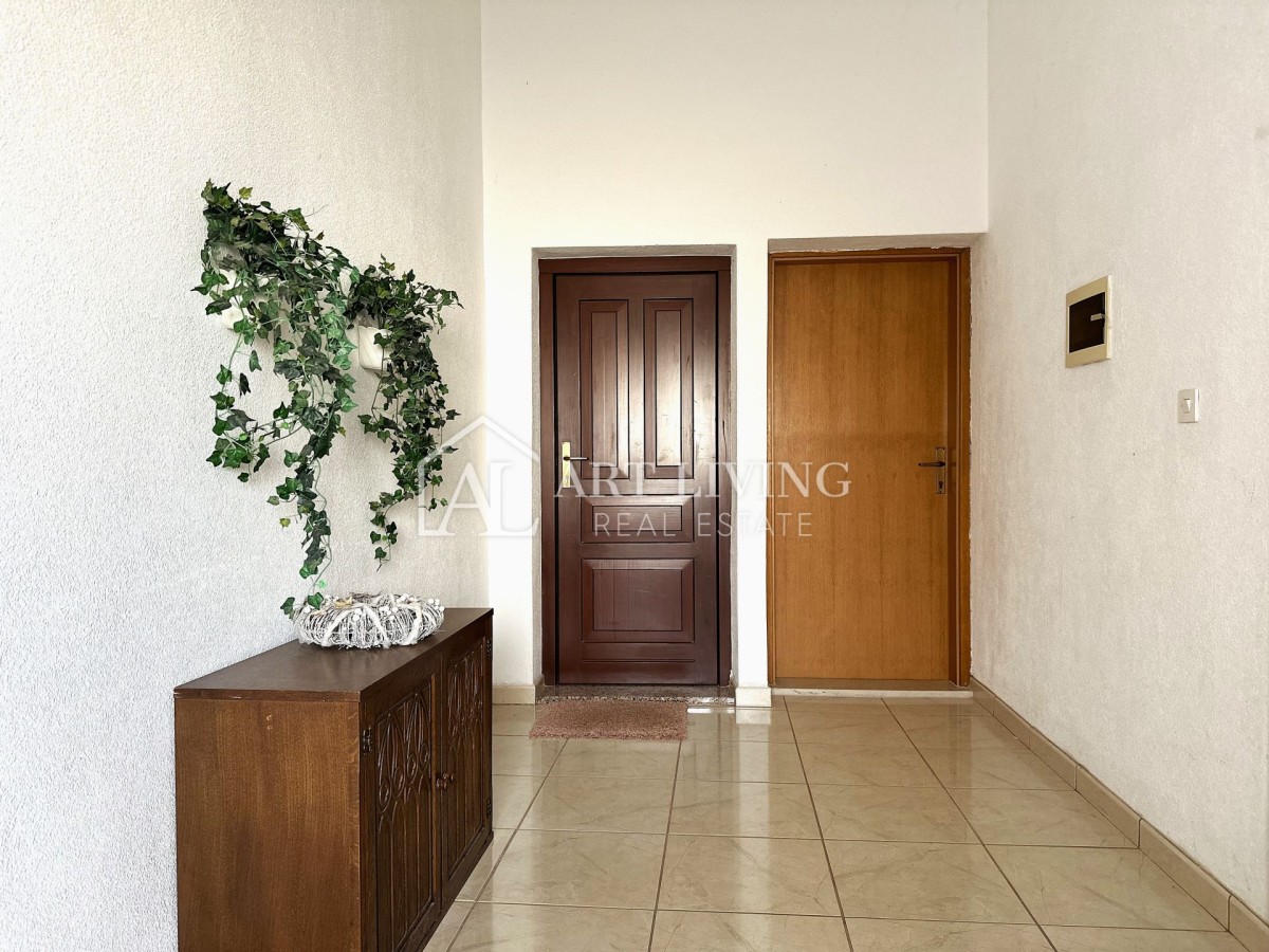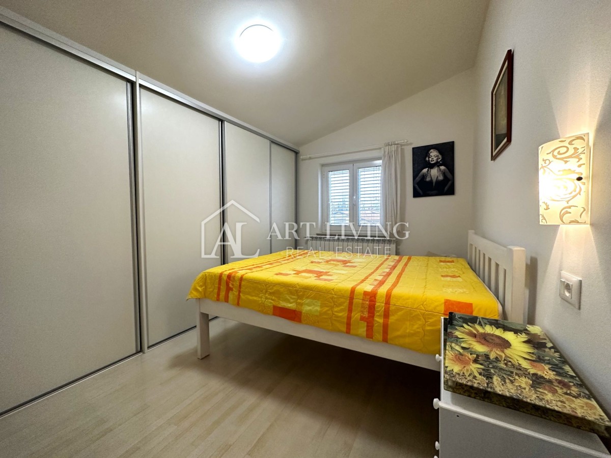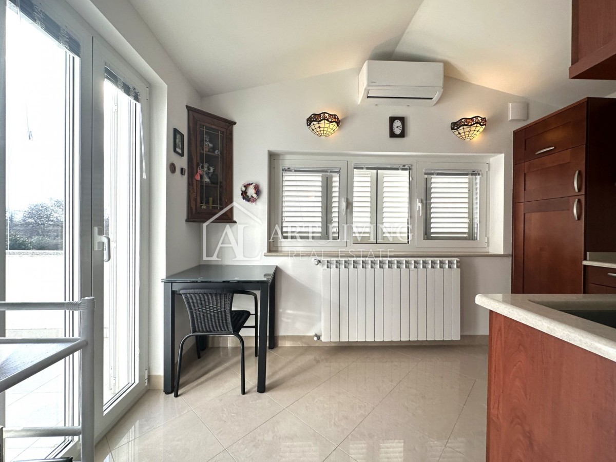 Die Wohnung befindet sich im ersten Stock, hat eine Wohnfläche von 70 m² und besteht aus einem Eingangsbereich, einem geräumigen Wohnzimmer, einer separaten Küche, zwei Schlafzimmern, einem Badezimmer und einer großzügigen Terrasse mit einem wunderschönen, beruhigenden Blick auf die umliegenden Olivenhaine und die malerische istrische Landschaft.
