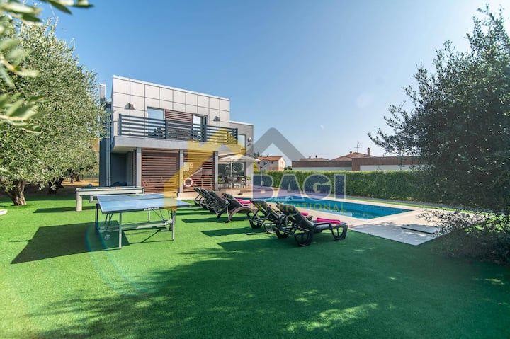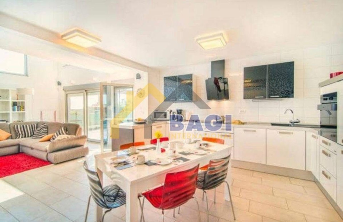 In unmittelbarer Nähe des Zentrums von Vodnjan steht eine wunderschöne Villa zum Verkauf. Die Wohnfläche beträgt 174 m², der Garten 1294 m². Das Haus wurde 2011 erbaut und seitdem regelmäßig renoviert und instand gehalten. Im Erdgeschoss befinden sich ein offener Wohn- und Küchenbereich mit Essbereich, Zugang zur Terrasse und zum Garten sowie ein Badezimmer. Im Obergeschoss erwarten Sie drei Schlafzimmer, ein Badezimmer und eine Terrasse. Die Villa verfügt über die Energieeffizienzklasse A+, Fußbodenheizung mit Wärmepumpe und Solaranlage. Im Garten befinden sich ein großer, beheizter Swimmingpool (7 x 3 m, Tiefe 1,4 m) mit Terrasse und Badebereich, 15 Olivenbäume, überdachte Parkplätze, ein Grillplatz, Billard und Tischtennis. Das Haus wurde 14 Jahre lang erfolgreich vermietet. Die Villa ist komplett möbliert und ausgestattet.