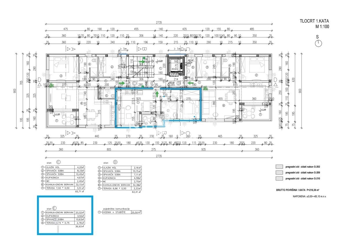 Wohnung C, Fläche 65,71 m2, besteht aus: Flur, 2 Schlafzimmern, Badezimmer, Gäste-WC, Küche und Esszimmer mit Wohnzimmer und Ausgang zur Terrasse.