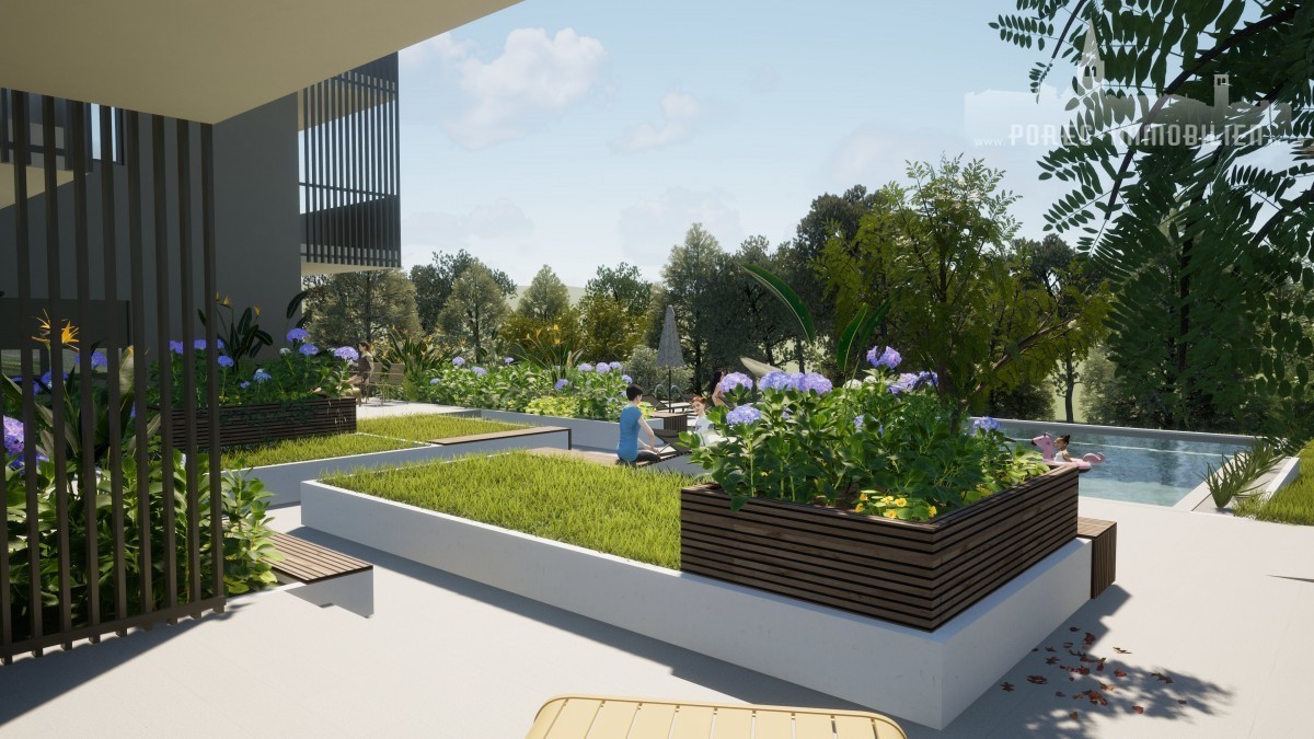 Die Wohnung wird mit elektrischer Fußbodenheizung und Klimaanlage ausgestattet. Der gemeinsame Gartenbereich wird über zwei Swimmingpools verfügen: einen 70 m² großen Pool für Erwachsene und einen 30 m² großen Pool für Kinder. Darüber hinaus wird es eine gepflasterte Liegewiese und eine großzügige Grünfläche mit mediterranen Pflanzen geben.