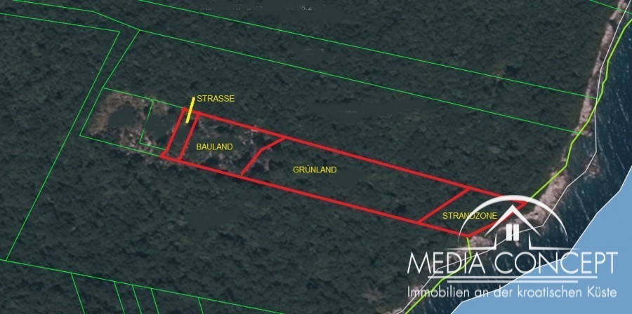 Erste Reihe vom Meer – 4.162 m² Land, davon 984 m² Bauland, bebaubar mit einem freistehenden Haus, Doppelhaus oder 4 Wohnungen. Im Anschluss an das Bauland ist eine Grünzone von 2.469 m², die man als Garten nutzen kann, der fast bis ans ans Meer reicht. Davor die Strandzone mit einer Breite von ca. 25 m und einer Größe von 709 m². Außerdem Teil der Straße von 219 m², davon einen Anteil von 72/219.