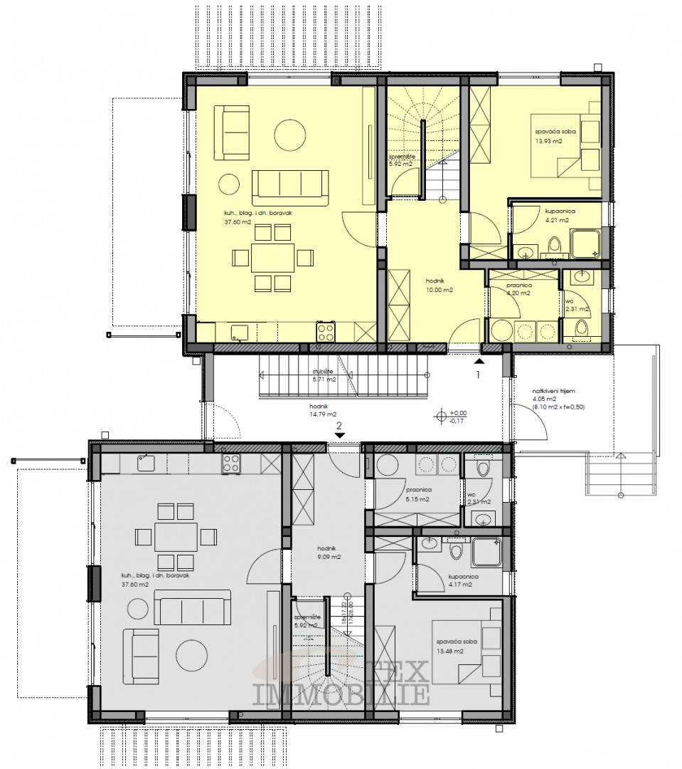 Im ersten Stock befinden sich zwei Schlafzimmer, jeweils mit eigenem Bad, sowie eine gemeinsame Terrasse. Im Untergeschoss gibt es einen Abstellraum von 7,67 m².