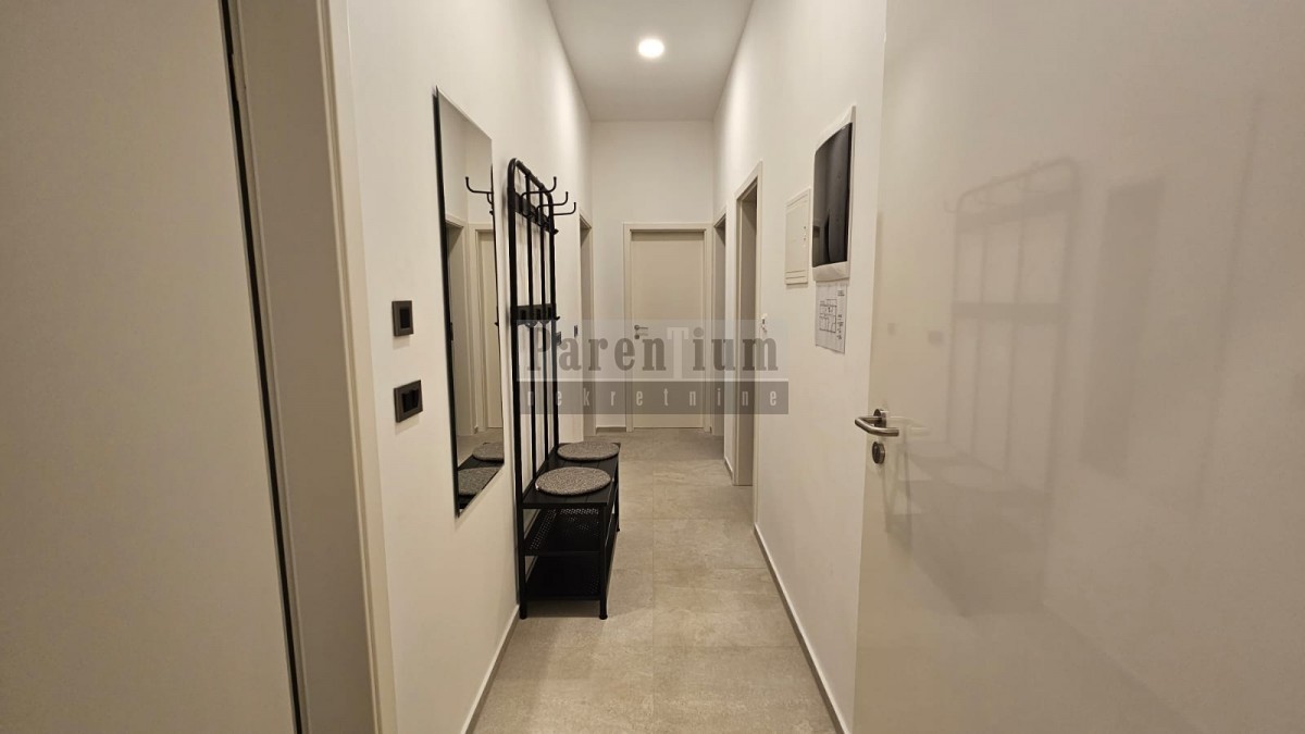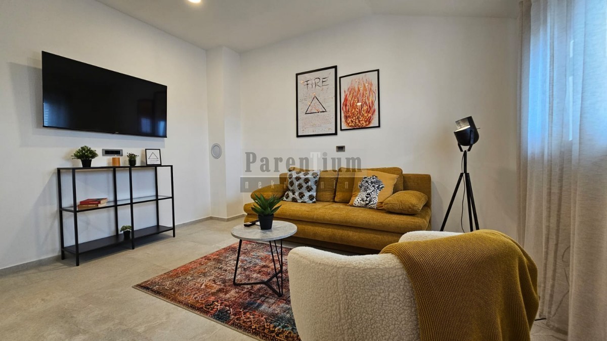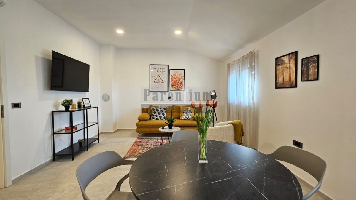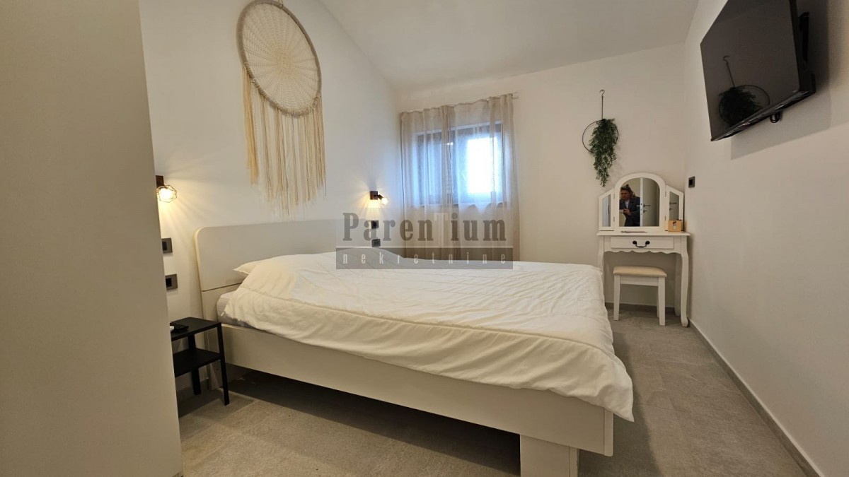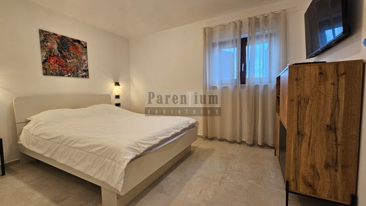 Im zweiten Stock eines Wohnhauses, das 3 km vom Meer und 9 km von der Stadt Porec entfernt ist, befindet sich diese Wohnung. Es besteht aus einer Eingangshalle, einem Wohnzimmer, einer offenen Küche und einem Esszimmer, zwei Schlafzimmern, einem Badezimmer und einer zusätzlichen Toilette mit Hauswirtschaftsraum. Die Wohnung bietet einen offenen Meerblick.